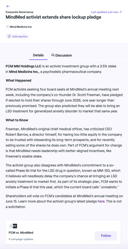 My name is Dr. Scott Freeman, and I am the co-founder of Mind Medicine. Along with three other individuals, I am standing for election at the upcoming annual meeting as nominees of FCM. We have a plan to get MindMed back on track and are so confident in our plan that we will lock up our shares until June 2025. We only benefit if other shareholders do too. Mind Medicine's board and management have repeatedly refused to demonstrate confidence in their plan by taking the same pledge.