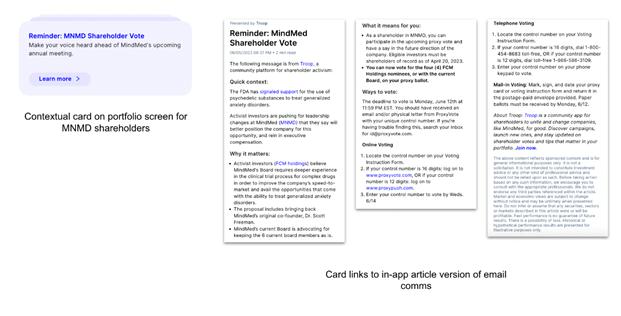 Troop is a community app for shareholders to unite and change companies, like MindMed, for good. Discover campaigns, launch new ones, and stay updated on shareholder votes and tips that matter in your portfolio.