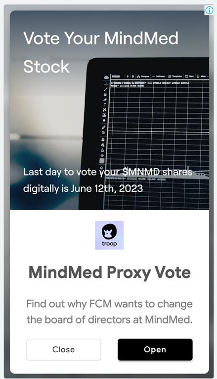 FCM MM Holdings, LLC, a Wyoming limited liability company, together with the other participants in its solicitation (collectively, “FCM”), has filed a definitive proxy statement and accompanying BLUE proxy card with the Securities and Exchange Commission to be used to solicit votes for the election of its slate of highly-qualified director nominees at the 2023 annual general meeting of shareholders of Mind Medicine (MindMed) Inc., a British Columbia corporation.