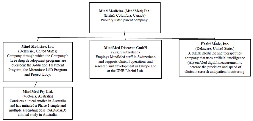 MindMed US is the Company’s main operating subsidiary, through which its drug development programs are overseen: Project Layla (18-MC for indications related to substance use disorders, as described below); Project Flow (LSD for Adult Attention Deficit/Hyperactivity Disorder (“ADHD”), as described below); Project Lucy (LSD for anxiety disorders, as described below); Project Angie (LSD for pain, as described below); and R(-)-MDMA to treat social anxiety and functioning in populations including Autism Spectrum Disorder. The Company’s collaboration with the University Hospital Basel’s Liechti Lab (the “UHB Liechti Lab”) and the Company’s other research and development efforts related to psychedelics are additionally supported through the Company’s Swiss subsidiary, MindMed Discover GmbH. Additionally, MindMed Pty Ltd. is conducting a Phase 1 study in normal healthy volunteers to determine the safety, tolerability and pharmacokinetics of single ascending doses (SAD) and multiple ascending doses (MAD) of 18-MC for as part of Project Layla and its program to develop novel therapies for substance use disorders.