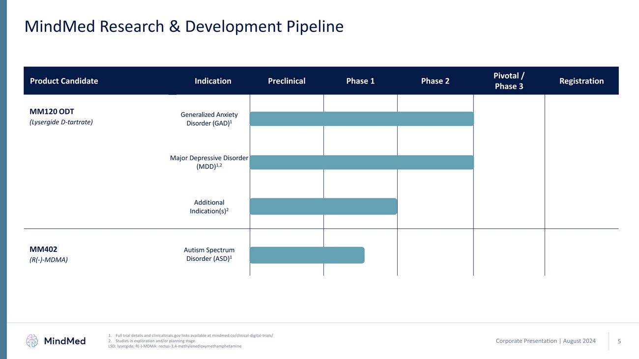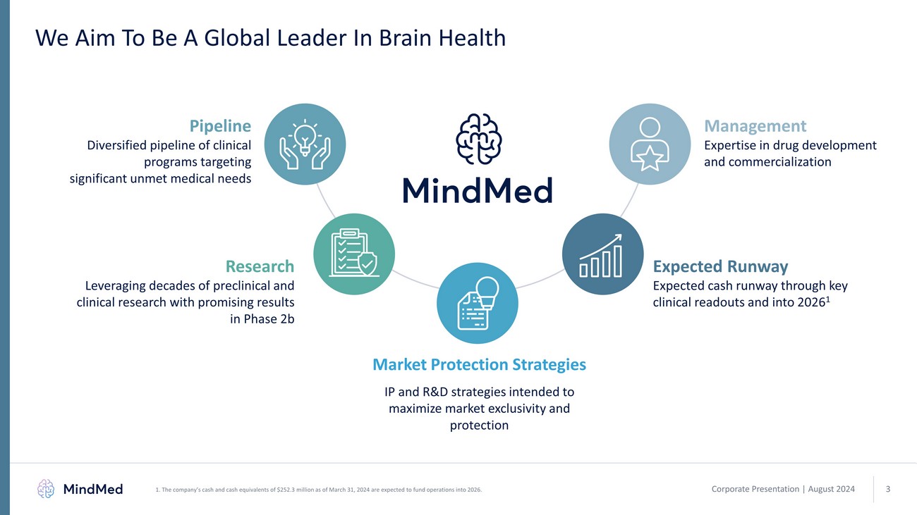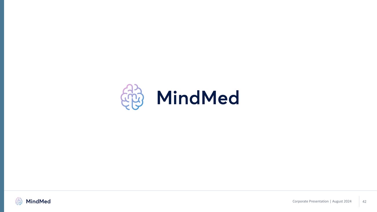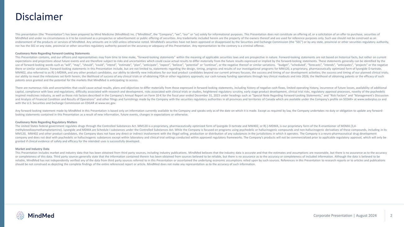 Corporate Presentation | August 2024 Disclaimer This presentation (the “Presentation”) has been prepared by Mind Medicine ( MindMed ) Inc. (“ MindMed ”, the “Company”, “we”, “our” or “us) solely for informational purposes. This Presentation does not constitute an offering of , o r a solicitation of an offer to purchase, securities of MindMed and under no circumstances is it to be construed as a prospectus or advertisement or public offering of securities. Any trade ma rks included herein are the property of the owners thereof and are used for reference purposes only. Such use should not be c ons trued as an endorsement of the products or services of MindMed . Any amounts are in USD unless otherwise noted. MindMed’s securities have not been approved or disapproved by the Securities and Exchange Commission (the "SEC") or by any state, provi nc ial or other securities regulatory authority, nor has the SEC or any state, provincial or other securities regulatory authority passed on the accuracy or adequacy of this Pre sentation. Any representation to the contrary is a criminal offense. Cautionary Note Regarding Forward - Looking Statements This Presentation contains, and our officers and representatives may from time to time make, “forward - looking statements” within the meaning of applicable securities laws and are prospective in nature. Forward - looking statements are not based on historical facts, but rather on current expectations and projections about future events and are therefore subject to risks and uncertainties which could cause actua l r esults to differ materially from the future results expressed or implied by the forward - looking statements. These statements gen erally can be identified by the use of forward - looking words such as “will”, “may", “should”, “could”, “intend”, “estimate”, “plan”, “anticipate”, “expect”, “be lieve”, “potential” or “continue”, or the negative thereof or similar variations. “budget”, “scheduled”, “forecasts”, “inten ds” , “anticipates”, “projects” or the negative there or similar variations. Forward - looking statements in this Presentation include, but are not limited to, statements regardi ng the design, timing, progress and results of our investigational programs for MM120, a proprietary, pharmaceutically optimi zed form of lysergide D - tartrate, MM402, also referred to as R( - ) - MDMA, and any other product candidates, our ability to identify new indications for our lead pro duct candidates beyond our current primary focuses, the success and timing of our development activities; the success and tim ing of our planned clinical trials; our ability to meet the milestones set forth herein; the likelihood of success of any clinical trials or of obtaining FDA or oth er regulatory approvals; our cash runway funding operations through key clinical readouts and into 2026; the likelihood of ob tai ning patents or the efficacy of such patents once granted and the potential for the markets that MindMed is anticipating to access. There are numerous risks and uncertainties that could cause actual results, plans and objectives to differ materially from th ose expressed in forward - looking statements, including history of negative cash flows, limited operating history, incurrence of fut ure losses, availability of additional capital, compliance with laws and regulations, difficulty associated with research and development, risks associated with cli nic al trials or studies, heightened regulatory scrutiny, early stage product development, clinical trial risks, regulatory appro val processes, novelty of the psychedelic inspired medicines industry, as well as those risk factors described in the Company's Annual Report on Form 10 - K for the fiscal year ended December 31, 2023 under headings such as “Special Note Regarding Forward - Looking Statements,” and “Risk Factors” and “Management's Discussion and Analysis of Financial Condition and Results of Operations” and other filings and furnishings made by the Company with the se curities regulatory authorities in all provinces and territories of Canada which are available under the Company's profile on SE DAR+ at www.sedarplus.ca and with the U.S. Securities and Exchange Commission on EDGAR at www.sec.gov. Any forward - looking statement made by MindMed in this Presentation is based only on information currently available to the Company and speaks only as of the date on which it is made. Except as required by law, the Company undertakes no duty or obligation to update any forward - looking statements contained in this Presentation as a result of new information, future events, changes in expectations or o the rwise. Cautionary Note Regarding Regulatory Matters The United States federal government regulates drugs through the Controlled Substances Act. MM120 is a proprietary, pharmaceu tic ally optimized form of lysergide D - tartrate and MM402, or R( - ) - MDMA, is our proprietary form of the R - enantiomer of MDMA (3,4 - methylenedioxymethamphetamine). Lysergide and MDMA are Schedule I substances under the Controlled Substances Act. While the Company is focused on programs using psyche de lic or hallucinogenic compounds and non - hallucinogenic derivatives of these compounds, including in its MM120, MM402 and other product candidates, the Company does not have any direct or indirect involvement with the illegal sel lin g, production or distribution of any substances in the jurisdictions in which it operates. The Company is a neuro - pharmaceutical drug development company and does not deal with psychedelic or hallucinogenic substances except within laboratory and clinical trial settings con ducted within approved regulatory frameworks. The Company's products will not be commercialized prior to applicable regulator y a pproval, which will only be granted if clinical evidence of safety and efficacy for th