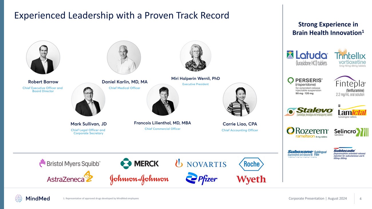 Corporate Presentation | August 2024 Experienced Leadership with a Proven Track Record 4 Strong Experience in Brain Health Innovation 1 1. Representative of approved drugs developed by MindMed employees
