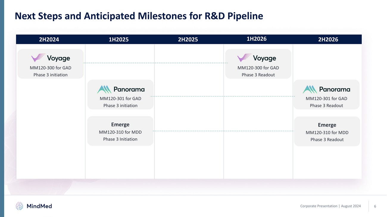 Corporate Presentation | August 2024 MindMed Research & Development Pipeline 1. Full trial details and clinicaltrials.gov links available at mindmed.co /clinical - digital - trials/ 2. Studies in exploration and/or planning stage. LSD: lysergide ; R( - ) - MDMA: rectus - 3,4 - methylenedioxymethamphetamine 5 Product Candidate Indication Preclinical Phase 1 Phase 2 Pivotal / Phase 3 Registration MM120 ODT ( Lysergide D - tartrate) Generalized Anxiety Disorder (GAD) 1 Major Depressive Disorder (MDD) 1,2 Additional Indication(s) 2 MM402 (R( - ) - MDMA) Autism Spectrum Disorder (ASD) 1 DK0