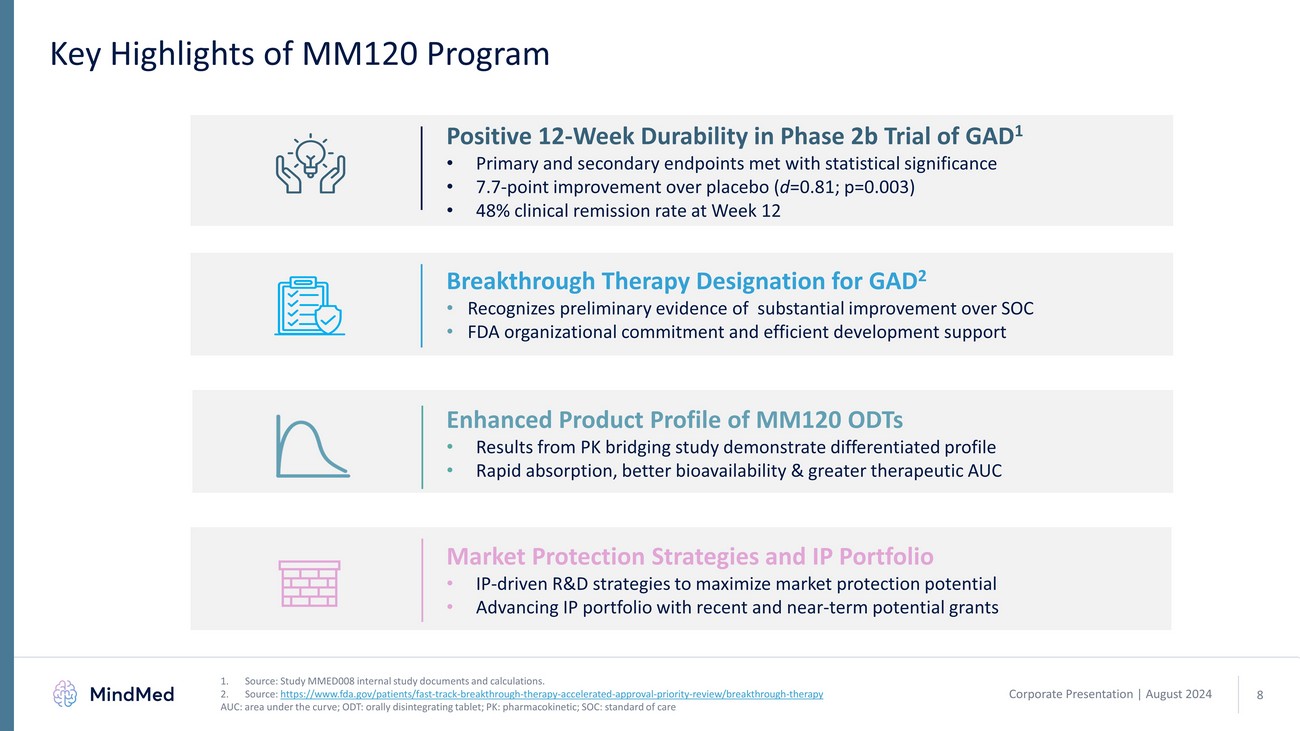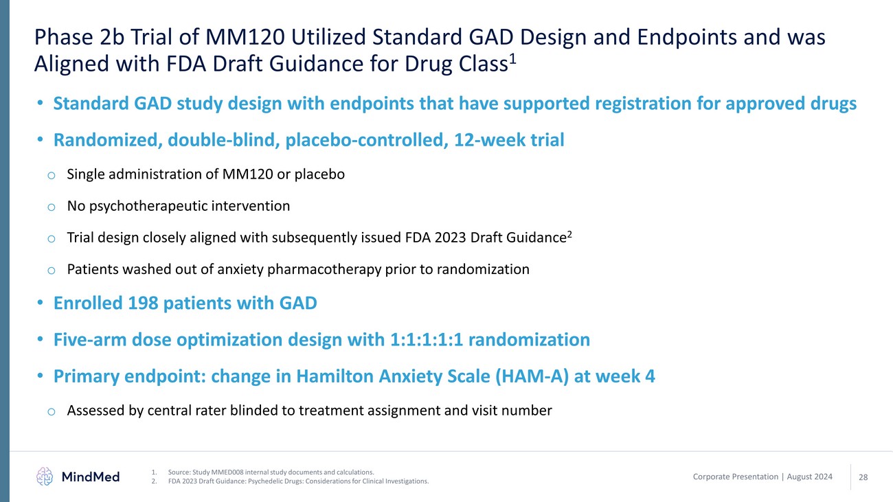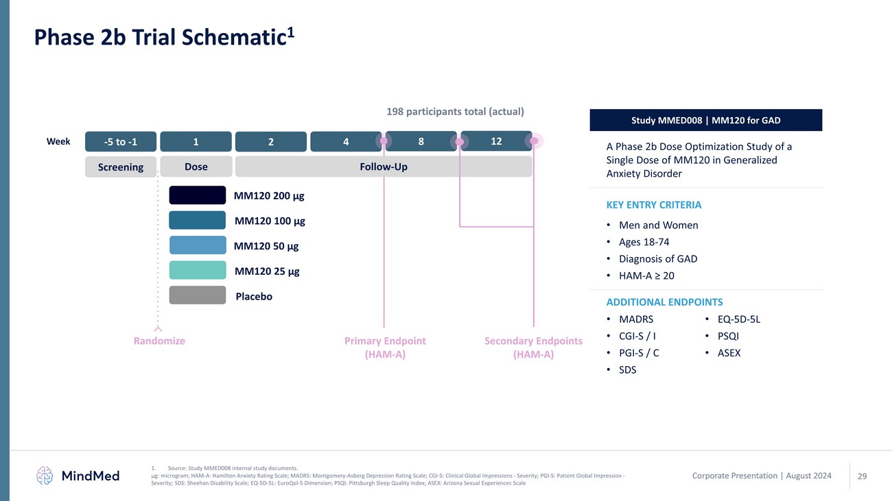 Corporate Presentation | August 2024 Phase 2b Trial of MM120 Utilized Standard GAD Design and Endpoints and was Aligned with FDA Draft Guidance for Drug Class 1 1. Source: Study MMED008 internal study documents and calculations. 2. FDA 2023 Draft Guidance: Psychedelic Drugs: Considerations for Clinical Investigations. 28 • Standard GAD study design with endpoints that have supported registration for approved drugs • Randomized, double - blind, placebo - controlled, 12 - week trial o Single administration of MM120 or placebo o No psychotherapeutic intervention o Trial design closely aligned with subsequently issued FDA 2023 Draft Guidance 2 o Patients washed out of anxiety pharmacotherapy prior to randomization • Enrolled 198 patients with GAD • Five - arm dose optimization design with 1:1:1:1:1 randomization • Primary endpoint: change in Hamilton Anxiety Scale (HAM - A) at week 4 o Assessed by central rater blinded to treatment assignment and visit numberDK0