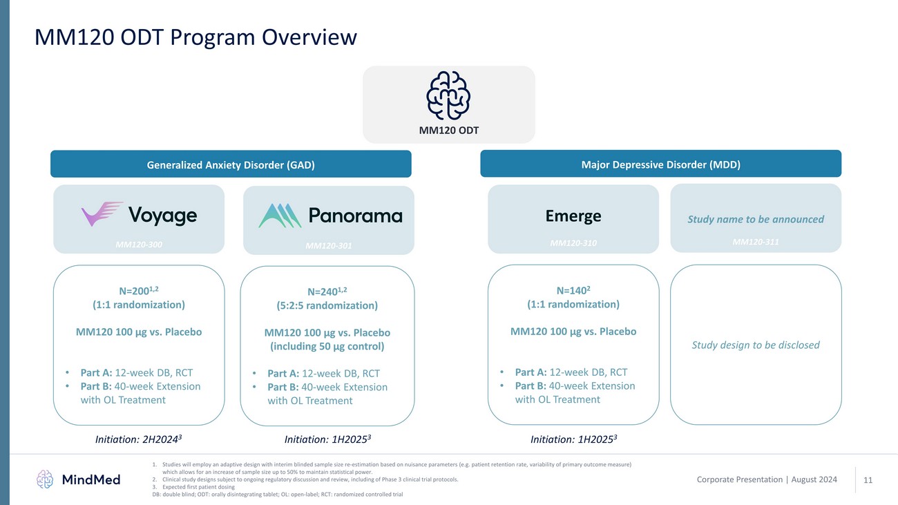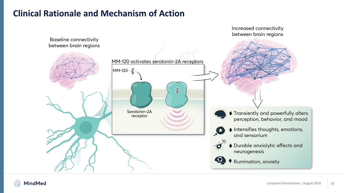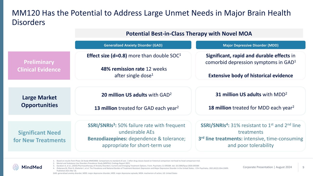 Corporate Presentation | August 2024 MM120 Has the Potential to Address Large Unmet Needs in Major Brain Health Disorders 1. Based on results from Phase 2b Study MMED008. Comparisons to standard of care / other drug classes based on historical compa ris on not head - to - head comparison trial. 2. Mental and Substance Use Disorders Prevalence Study (MDPSU): Findings Report 2023. 3. Garakani A, et al., (2020) Pharmacotherapy of Anxiety Disorders: Current and Emerging Treatment Options. Front. Psychiatry 11:595584. doi : 10.3389/fpsyt.2020.595584 4. Zhdanava M, Pilon D, Ghelerter I, et al. The Prevalence and National Burden of Treatment - Resistant Depression and Major Depressive Disorder in the United Stat es. J Clin Psychiatry. 2021;82(2):20m13699. Published 2021 Mar 16. GAD: generalized anxiety disorder; MDD: major depressive disorder; MDE: major depressive episode; MOA: mechanism of action; U S: United States Potential Best - in - Class Therapy with Novel MOA Large Market Opportunities Significant Need for New Treatments 20 million US adults with GAD 2 13 million treated for GAD each year 2 SSRI/SNRIs 3 : 50% failure rate with frequent undesirable AEs Benzodiazepines: dependence & tolerance; appropriate for short - term use 9 Preliminary Clinical Evidence Effect size (d=0.8) more than double SOC 1 48% remission rate 12 weeks after single dose 1 Generalized Anxiety Disorder (GAD) Major Depressive Disorder (MDD) Significant, rapid and durable effects in comorbid depression symptoms in GAD 1 Extensive body of historical evidence SSRI/SNRIs 4 : 31% resistant to 1 st and 2 nd line treatments 3 rd line treatments: intensive, time - consuming and poor tolerability 31 million US adults with MDD 2 18 million treated for MDD each year 2