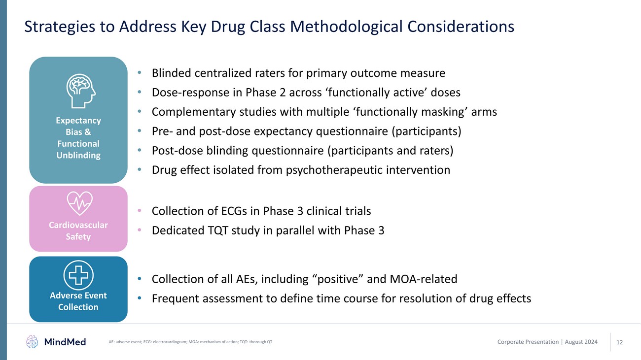 Corporate Presentation | August 2024 MM120 ODT Program Overview 1. Studies will employ an adaptive design with interim blinded sample size re - estimation based on nuisance parameters (e.g. patient retention rate, variability of primary outcome measure) which allows for an increase of sample size up to 50% to maintain statistical power. 2. Clinical study designs subject to ongoing regulatory discussion and review, including of Phase 3 clinical trial protocols. 3. Expected first patient dosing DB: double blind; ODT: orally disintegrating tablet; OL: open - label; RCT: randomized controlled trial 11 MM120 - 300 MM120 - 301 MM120 ODT Generalized Anxiety Disorder (GAD) Major Depressive Disorder (MDD) Emerge MM120 - 310 N=200 1,2 (1 :1 randomization) MM120 100 µg vs. Placebo • Part A: 12 - week DB, RCT • Part B: 40 - week Extension with OL Treatment N=240 1,2 (5:2:5 randomization) MM120 100 µg vs. Placebo (including 50 µg control) • Part A: 12 - week DB, RCT • Part B: 40 - week Extension with OL Treatment N=140 2 (1:1 randomization) MM120 100 µg vs. Placebo • Part A: 12 - week DB, RCT • Part B: 40 - week Extension with OL Treatment Initiation: 2H2024 3 Initiation: 1H2025 3 Initiation: 1H2025 3 Study name to be announced MM120 - 311 Study design to be disclosedDK0