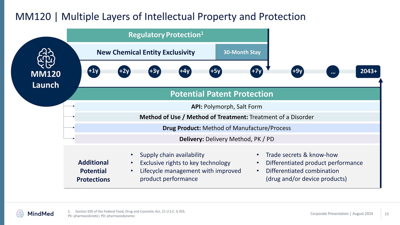 Corporate Presentation | August 2024 +1y +2y +3y +4y +9y +5y +7y … 2043+ New Chemical Entity Exclusivity 30 - Month Stay 1. Section 505 of the Federal Food, Drug and Cosmetic Act, 21 U.S.C. § 355. PK: pharmacokinetic; PD: pharmacodynamic MM120 Launch Potential Patent Protection Method of Use / Method of Treatment: Treatment of a Disorder Delivery: Delivery Method, PK / PD Drug Product: Method of Manufacture/Process API: Polymorph, Salt Form • Supply chain availability • Exclusive rights to key technology • Lifecycle management with improved product performance • Trade secrets & know - how • Differentiated product performance • Differentiated combination (drug and/or device products) Additional Potential Protections Regulatory Protection 1 MM120 | Multiple Layers of Intellectual Property and Protection 13
