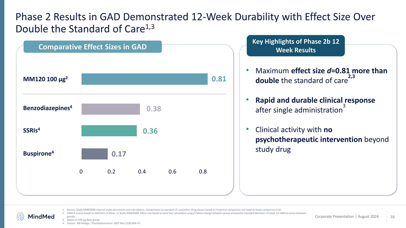 Corporate Presentation | August 2024 MM120 for GAD | Phase 3 Program Overview 15 1. Clinical study designs subject to ongoing regulatory discussion and review, including of Phase 3 clinical trial protocols 2. Primary endpoint in Phase 2b study was change from baseline to Week 4 3. Phase 2b study required 12 - hour minimum duration of treatment session monitoring EOP2: end of Phase 2; GAD: generalized anxiety disorder Phase 3 Program Consistent Protocol Design & Conduct Program Alignment Two Phase 3 pivotal clinical trials in GAD 1 • 12 - week randomized, placebo - controlled primary efficacy study design • 40 - week extension phase to characterize safety and define retreatment parameters Key design elements largely consistent between Phase 2b and Phase 3 studies • Hamilton Anxiety Scale (HAM - A) primary outcome measure - Primary endpoint: change from baseline to Week 12 2 • Limited changes to key inclusion/exclusion criteria - No planned change in dosing session monitoring protocol • Duration of treatment session monitoring reduced to 8 hours 3 Alignment with FDA on program design reached at EOP2 meeting • Study designs believed to be consistent with FDA guidance • Program initiation expected in 2H2024 DK0
