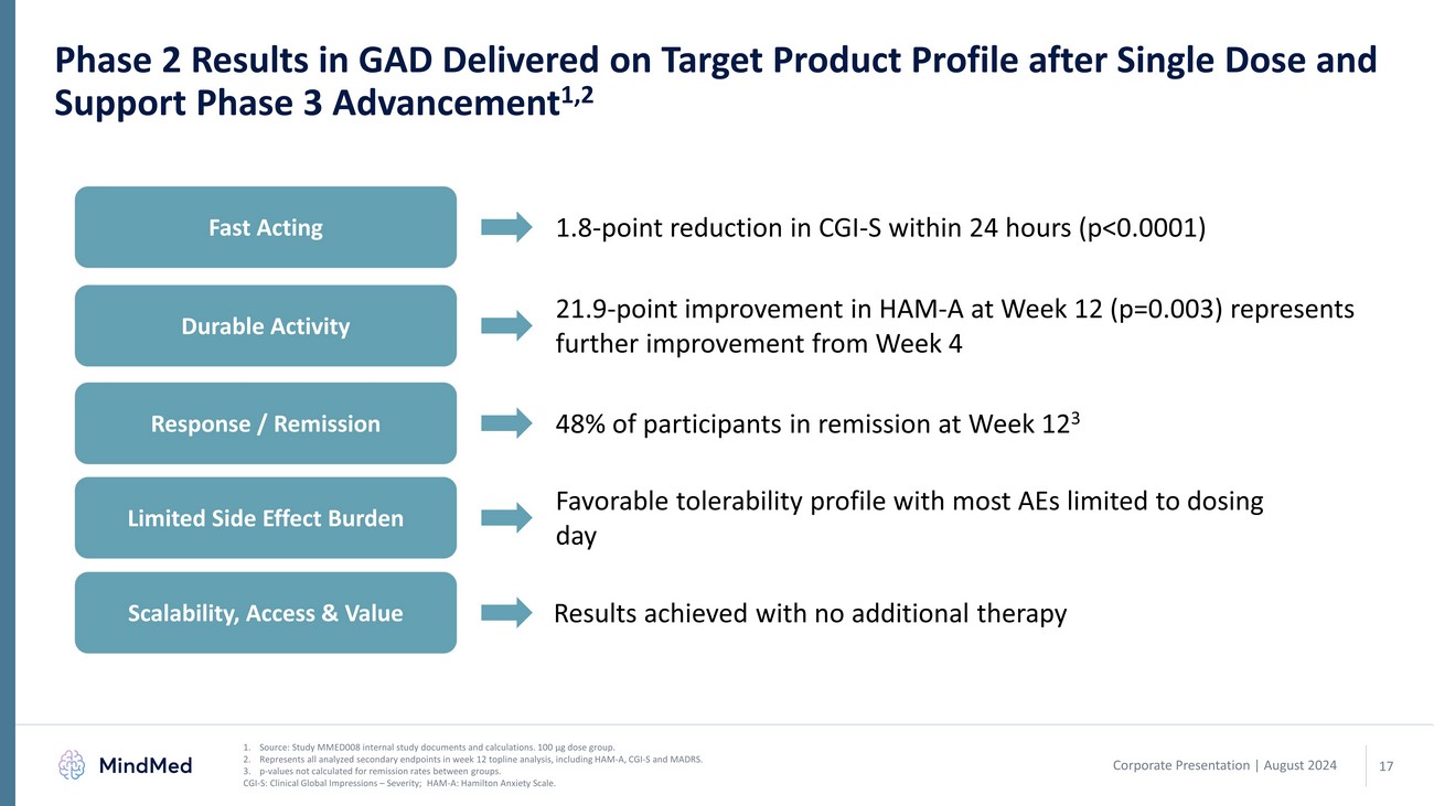 Corporate Presentation | August 2024 Phase 2 Results in GAD Demonstrated 12 - Week Durability with Effect Size Over Double the Standard of Care 1,3 1. Source: Study MMED008 internal study documents and calculations. Comparisons to standard of care/other drug classes based on his torical comparison not head - to - head comparison trial. 2. HAM - A scores based on ANCOVA LS Mean. in Study MMED008. Effect size based on post hoc calculation using LS Mean change between g roup and pooled standard deviation of week 12 HAM - A scores between groups. 3. Based on 100 µg dose group. 4. Source: RB Hidalgo, J Psychopharmacol . 2007 Nov;21(8):864 - 72. • Maximum effect size d =0.81 more than double the standard of care 2,3 • Rapid and durable clinical response after single administration 3 • Clinical activity with no psychotherapeutic intervention beyond study drug ^^Z/Ɛ ϰ ĞŶnjŽĚŝĂnj Ğ ƉŝŶĞ s 4 0 0.2 0.4 0.6 0.8 0.38 0.36 ƵƐƉŝƌŽŶĞ ϰ 0.17 0.81 MM120 100 µg 2 Comparative Effect Sizes in GAD Key Highlights of Phase 2b 12 Week Results 16