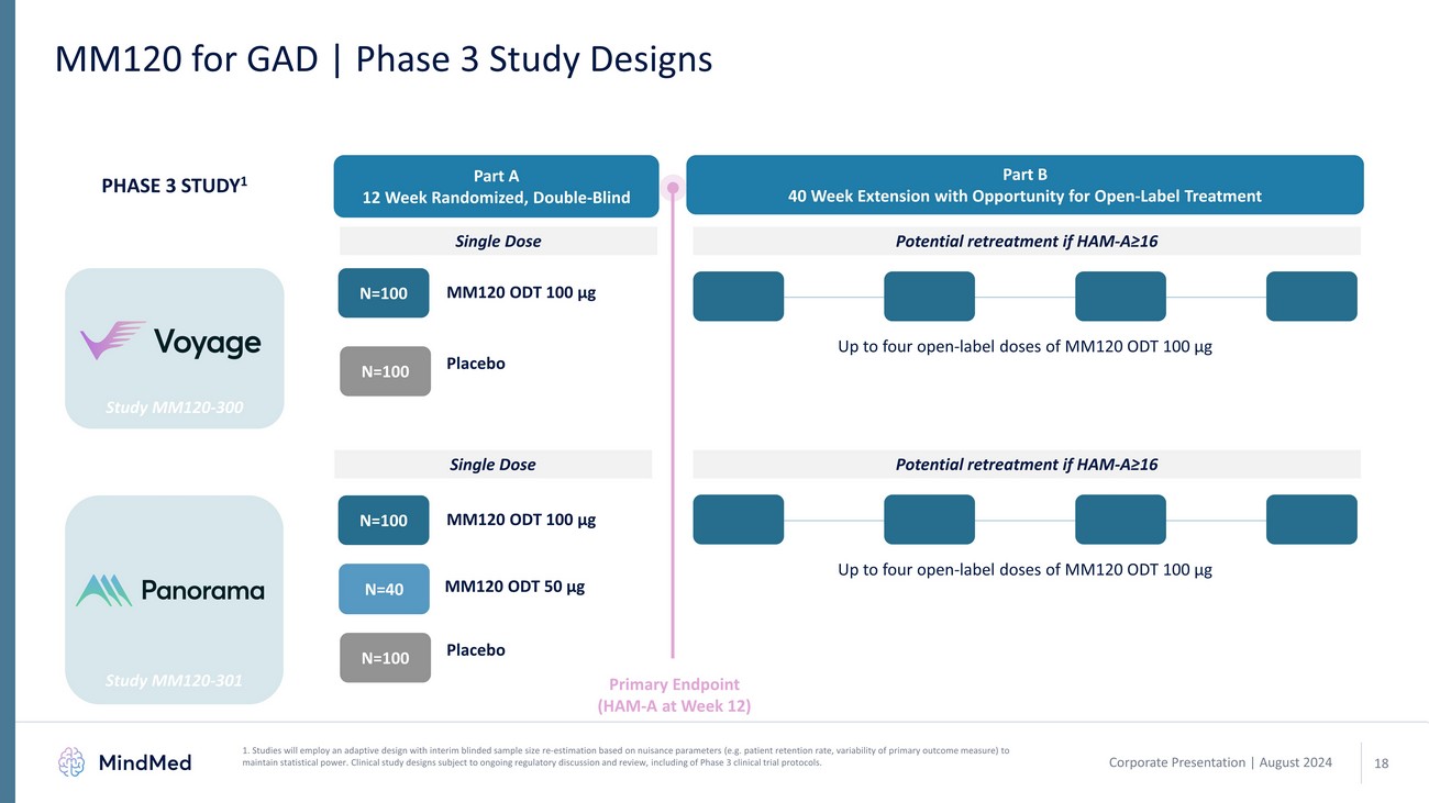 Corporate Presentation | August 2024 17 Phase 2 Results in GAD Delivered on Target Product Profile after Single Dose and Support Phase 3 Advancement 1,2 1. Source: Study MMED008 internal study documents and calculations. 100 µg dose group. 2. Represents all analyzed secondary endpoints in week 12 topline analysis, including HAM - A, CGI - S and MADRS. 3. p - values not calculated for remission rates between groups. CGI - S: Clinical Global Impressions – Severity; HAM - A: Hamilton Anxiety Scale. Fast Acting Response / Remission Durable Activity Scalability, Access & Value 1.8 - point reduction in CGI - S within 24 hours (p<0.0001) 21.9 - point improvement in HAM - A at Week 12 (p=0.003) represents further improvement from Week 4 48% of participants in remission at Week 12 3 Limited Side Effect Burden Favorable tolerability profile with most AEs limited to dosing day Results achieved with no additional therapyDK0