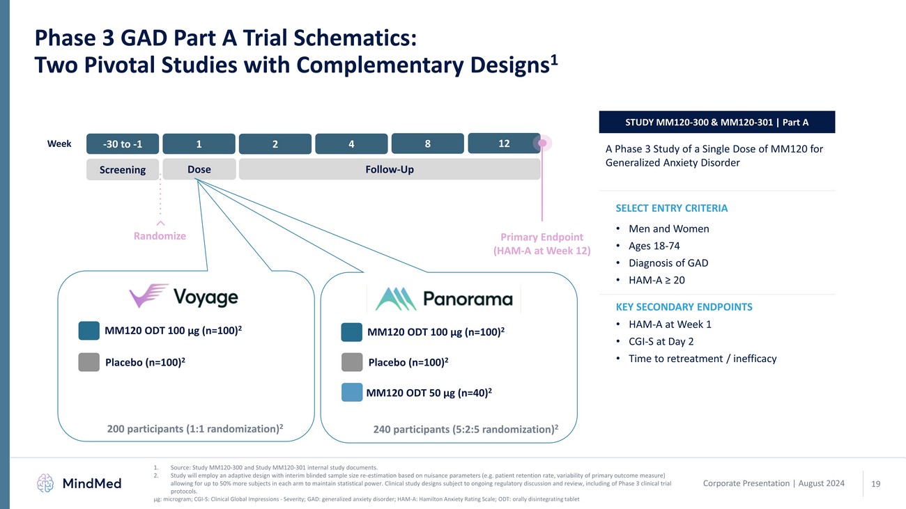 Corporate Presentation | August 2024 Study MM120 - 301 Study MM120 - 300 MM120 for GAD | Phase 3 Study Designs 1. Studies will employ an adaptive design with interim blinded sample size re - estimation based on nuisance parameters (e.g. pati ent retention rate, variability of primary outcome measure) to maintain statistical power. Clinical study designs subject to ongoing regulatory discussion and review, including of Phase 3 cli nical trial protocols. 18 MM120 ODT 1 00 µg N=100 Placebo N=100 Part A 12 Week Randomized, Double - Blind Part B 40 Week Extension with Opportunity for Open - Label Treatment MM120 ODT 1 00 µg N=100 Placebo N=100 MM120 ODT 50 µg N=40 PHASE 3 STUDY 1 Single Dose Potential retreatment if HAM - A≥16 Primary Endpoint (HAM - A at Week 12) Up to four open - label doses of MM120 ODT 1 00 µg Single Dose Potential retreatment if HAM - A≥16 Up to four open - label doses of MM120 ODT 1 00 µg DK0