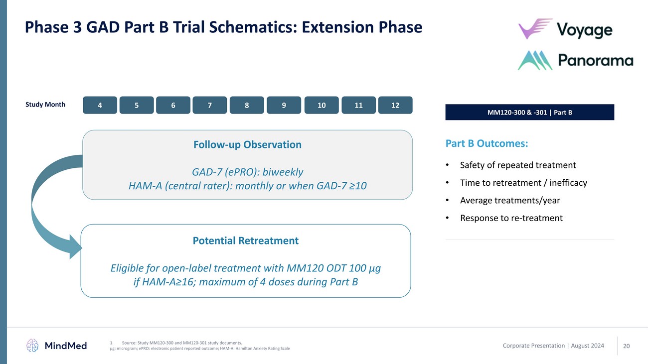 Corporate Presentation | August 2024 19 Phase 3 GAD Part A Trial Schematics: Two Pivotal Studies with Complementary Designs 1 1. Source: Study MM120 - 300 and Study MM120 - 301 internal study documents. 2. Study will employ an adaptive design with interim blinded sample size re - estimation based on nuisance parameters (e.g. patient r etention rate, variability of primary outcome measure) allowing for up to 50% more subjects in each arm to maintain statistical power. Clinical study designs subject to ongoing reg ula tory discussion and review, including of Phase 3 clinical trial protocols. μ g: microgram; CGI - S: Clinical Global Impressions - Severity; GAD: generalized anxiety disorder; HAM - A: Hamilton Anxiety Rating S cale; ODT: orally disintegrating tablet STUDY MM120 - 300 & MM120 - 301 | Part A • HAM - A at Week 1 • CGI - S at Day 2 • Time to retreatment / inefficacy SELECT ENTRY CRITERIA • Men and Women • Ages 18 - 74 • Diagnosis of GAD • HAM - A ≥ 20 A Phase 3 Study of a Single Dose of MM120 for Generalized Anxiety Disorder KEY SECONDARY ENDPOINTS 240 participants (5:2:5 randomization) 2 Week Randomize - 30 to - 1 1 2 4 8 12 MM120 ODT 1 00 µg (n=100) 2 MM120 ODT 50 µg (n=40) 2 Placebo (n=100) 2 Screening Dose Follow - Up Primary Endpoint (HAM - A at Week 12) 200 participants (1:1 randomization) 2 MM120 ODT 1 00 µg (n=100) 2 Placebo (n=100) 2