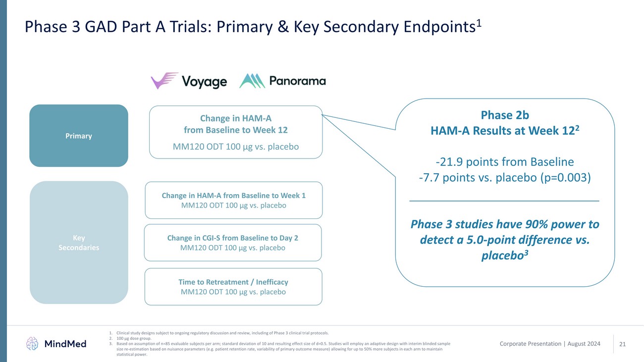 Corporate Presentation | August 2024 20 Phase 3 GAD Part B Trial Schematics: Extension Phase 1. Source: Study MM120 - 300 and MM120 - 301 study documents. μ g: microgram; ePRO: electronic patient reported outcome; HAM - A: Hamilton Anxiety Rating Scale 4 5 6 7 8 9 10 11 12 Study Month Follow - up Observation GAD - 7 (ePRO): biweekly HAM - A (central rater): monthly or when GAD - 7 ≥10 Potential Retreatment Eligible for open - label treatment with MM120 ODT 100 µg if HAM - A≥16; maximum of 4 doses during Part B MM120 - 300 & - 301 | Part B Part B Outcomes: • Safety of repeated treatment • Time to retreatment / inefficacy • Average treatments/year • Response to re - treatment