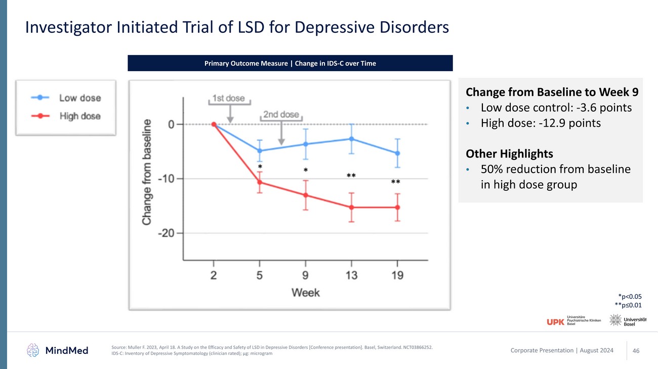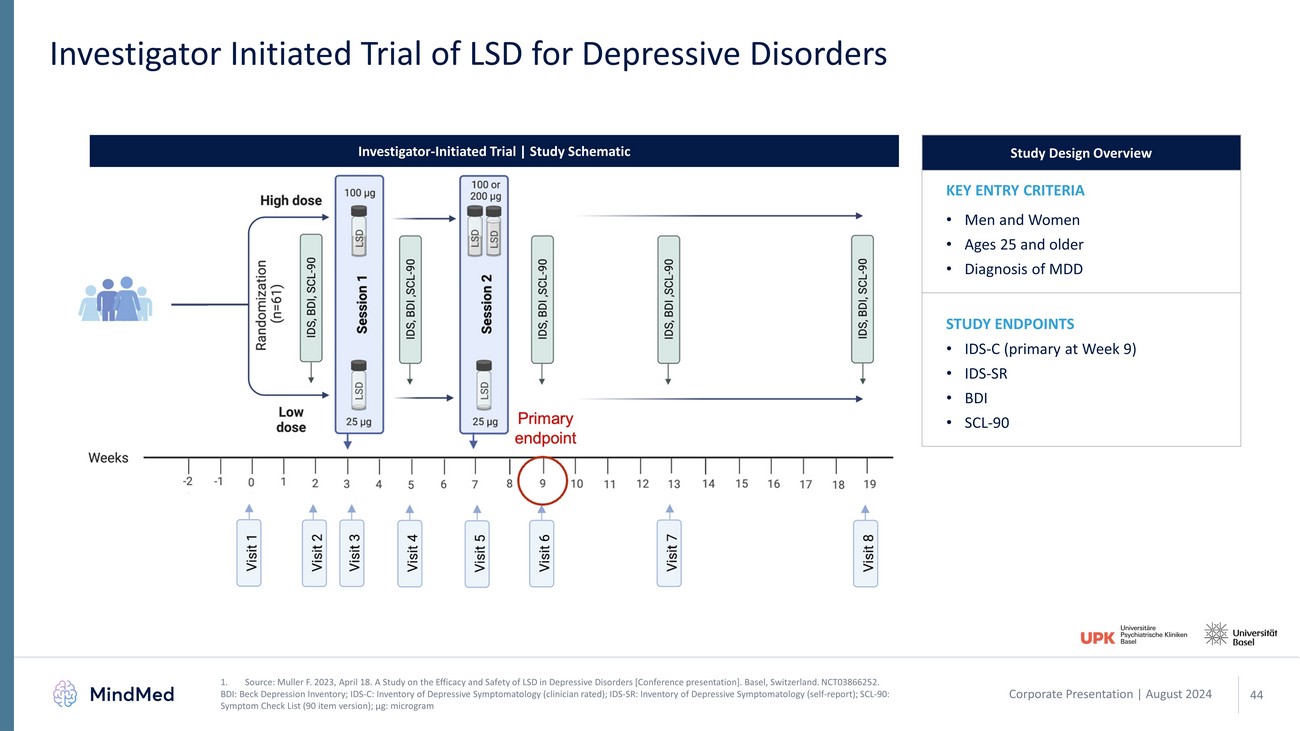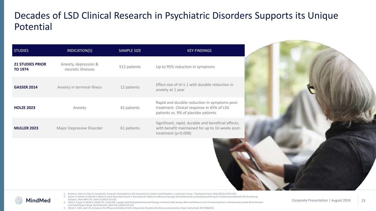 Corporate Presentation | August 2024 Decades of LSD Clinical Research in Psychiatric Disorders Supports its Unique Potential 1. Rucker JJ, Jelen LA, Flynn S, Frowde KD, Young AH. Psychedelics in the treatment of unipolar mood disorders: a systematic review. J Psychopharmacol . 2016;30(12):1220 - 1229. 2. Gasser P, Holstein D, Michel Y, Doblin R, Yazar - Klosinski B, Passie T, Brenneisen R. Safety and efficacy of lysergic acid diethylamide - assisted psychotherapy for anxiety associated with life - threatening diseases. J Nerv Ment Dis. 2014 Jul;202(7):513 - 20. 3. Holze F, Gasser P, Müller F, Dolder PC, Liechti ME. Lysergic Acid Diethylamide - Assisted Therapy in Patients With Anxiety With and Without a Life - Threatening Illness: A Randomi zed, Double - Blind, Placebo - Controlled Phase II Study. Biol Psychiatry. 2023 Feb 1;93(3):215 - 223. 4. Muller F. 2023, April 18. A Study on the Efficacy and Safety of LSD in Depressive Disorders [Conference presentation]. Basel, Sw itzerland. NCT03866252. 23 STUDIES INDICATION(S) SAMPLE SIZE KEY FINDINGS 21 STUDIES PRIOR TO 1974 Anxiety, depression & neurotic illnesses 512 patients Up to 95% reduction in symptoms GASSER 2014 Anxiety in terminal illness 12 patients Effect size of d=1.1 with durable reduction in anxiety at 1 year HOLZE 2023 Anxiety 42 patients Rapid and durable reduction in symptoms post - treatment. Clinical response in 65% of LSD patients vs. 9% of placebo patients MULLER 2023 Major Depressive Disorder 61 patients Significant, rapid, durable and beneficial effects, with benefit maintained for up to 16 weeks post - treatment (p=0.008)