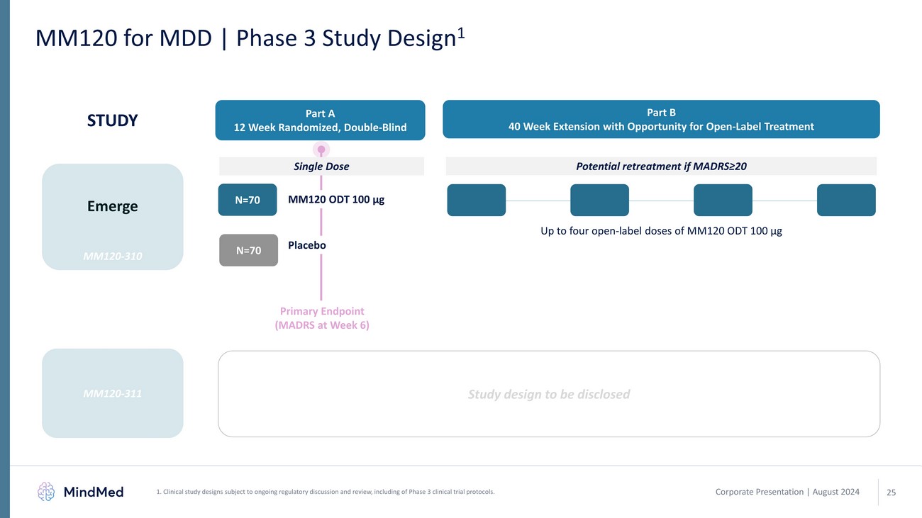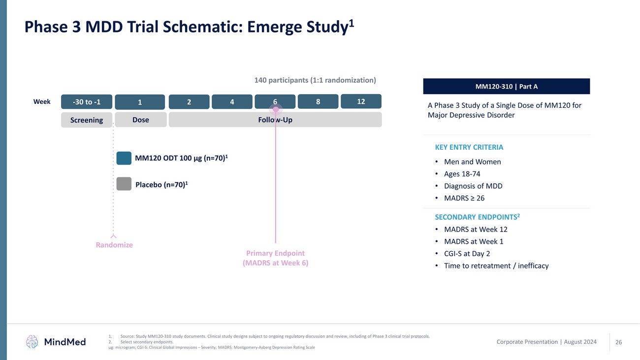 Corporate Presentation | August 2024 Emerge MM120 - 310 MM120 for MDD | Phase 3 Study Design 1 1. Clinical study designs subject to ongoing regulatory discussion and review, including of Phase 3 clinical trial protocols. 25 N=70 N=70 Part A 12 Week Randomized, Double - Blind Part B 40 Week Extension with Opportunity for Open - Label Treatment STUDY Primary Endpoint (MADRS at Week 6) Potential retreatment if MADRS≥20 Up to four open - label doses of MM120 ODT 1 00 µg MM120 ODT 1 00 µg Placebo Single Dose MM120 - 311 Study design to be disclosed