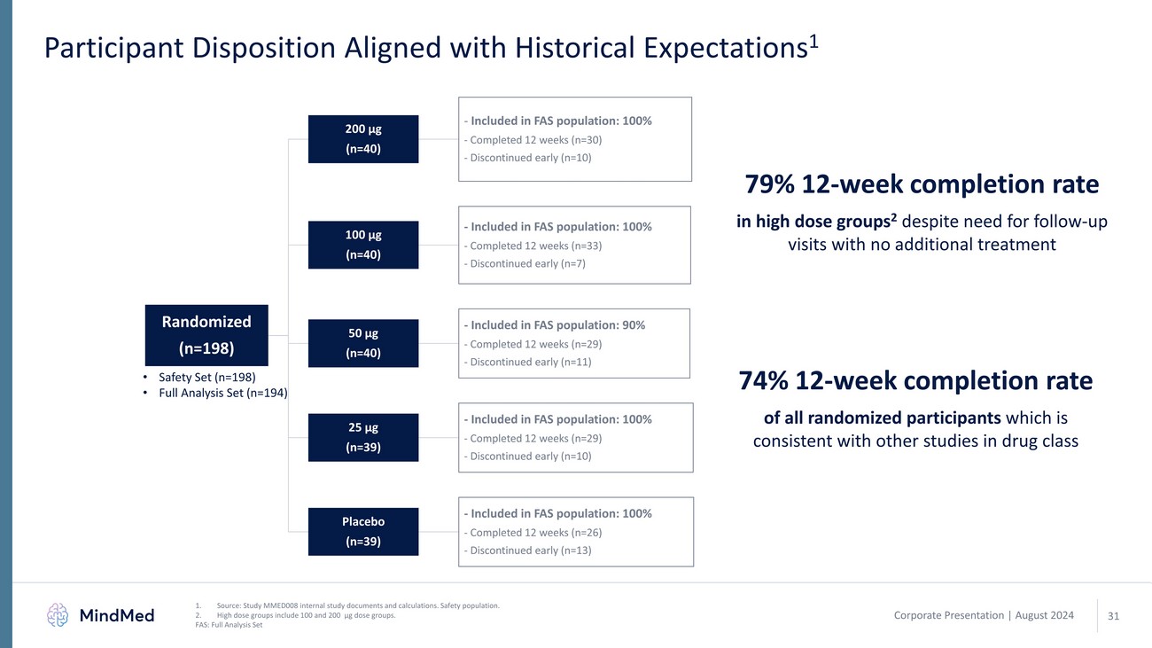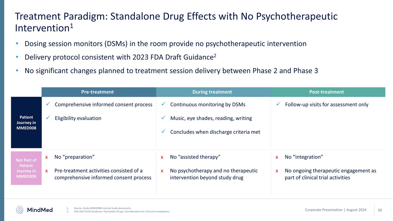 Corporate Presentation | August 2024 Treatment Paradigm: Standalone Drug Effects with No Psychotherapeutic Intervention 1 1. Source: Study MMED008 internal study documents. 2. FDA 2023 Draft Guidance: Psychedelic Drugs: Considerations for Clinical Investigations. • Dosing session monitors (DSMs) in the room provide no psychotherapeutic intervention • Delivery protocol consistent with 2023 FDA Draft Guidance 2 • No significant changes planned to treatment session delivery between Phase 2 and Phase 3 Patient Journey in MMED008 x Comprehensive informed consent process x Eligibility evaluation x Continuous monitoring by DSMs x Music, eye shades, reading, writing x Concludes when discharge criteria met x Follow - up visits for assessment only Pre - treatment During treatment Post - treatment Not Part of Patient Journey in MMED008 x No “preparation” x Pre - treatment activities consisted of a comprehensive informed consent process x No “assisted therapy” x No psychotherapy and no therapeutic intervention beyond study drug x No “integration” x No ongoing therapeutic engagement as part of clinical trial activities 30