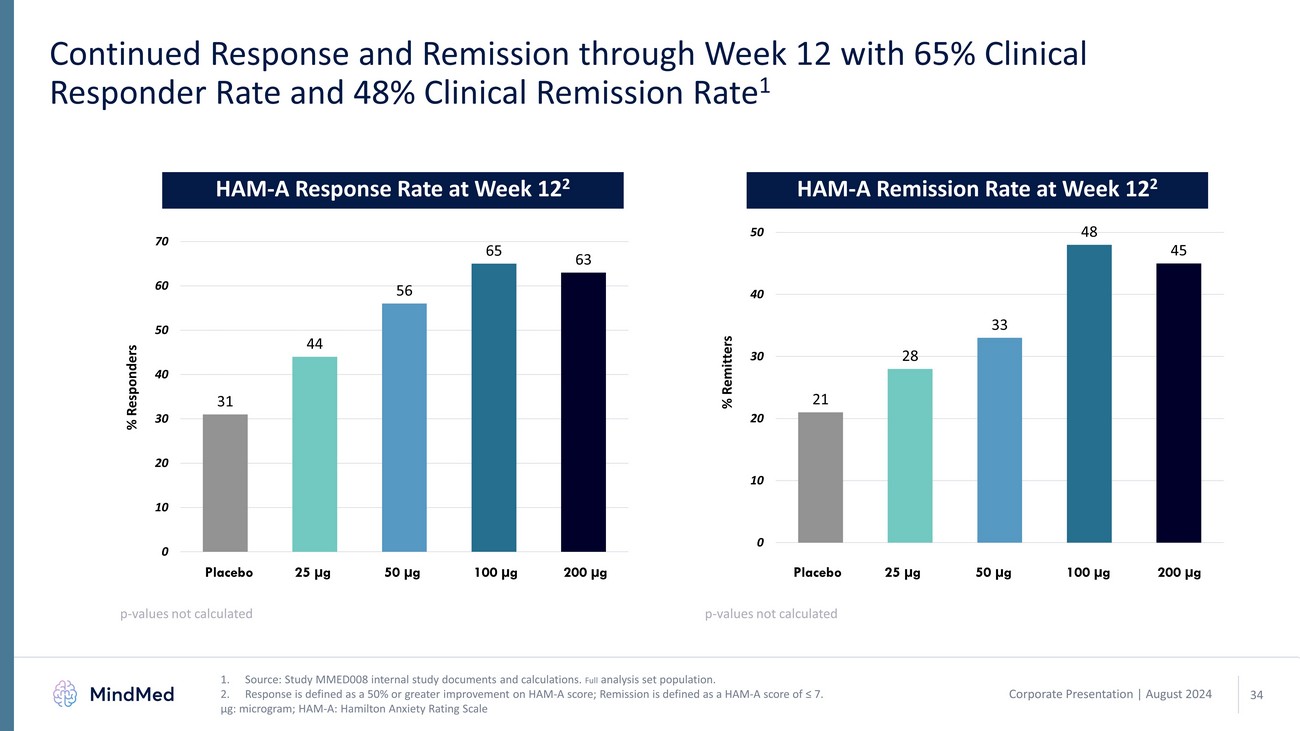 Corporate Presentation | August 2024 -25 -20 -15 -10 -5 0 LS Mean Change (SEM) in HAM - A score Placebo 25 µg 50 µg 100 µg 200 µg HAM - A Change from Baseline 33 Statistically and Clinically Significant Reductions in HAM - A Score Continued at Week 12 1,2 1. Source: Study MMED008 internal study documents and calculations. Full analysis set population. 2. Based on 100 µg dose group. μ g: microgram; HAM - A: Hamilton Anxiety Rating Scale; NOTE: Significance achieved despite study not being powered for these pairwi se comparisons. *p<0.05 **p≤0.01 ***p≤0.001 Change from Baseline 2 • Week 4: - 21.3 points • Week 12: - 21.9 points Improvement over Placebo 2 • Week 4: - 7.6 pts, p=0.0004 • Week 12: - 7.7 pts, p=0.003 *** ** *** *** *** ** * ** **DK0