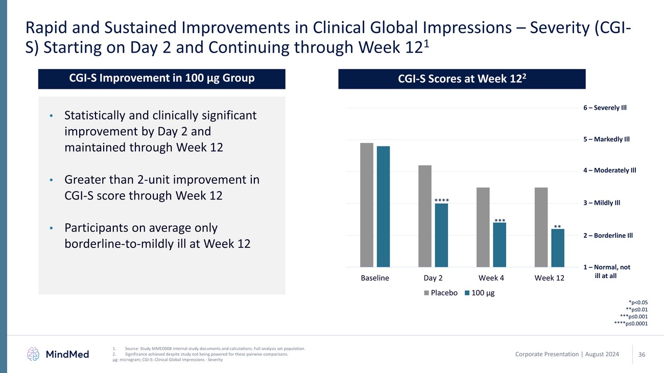 Corporate Presentation | August 2024 CGI - S Scores at Week 12 2 36 Rapid and Sustained Improvements in Clinical Global Impressions – Severity (CGI - S) Starting on Day 2 and Continuing through Week 12 1 1. Source: Study MMED008 internal study documents and calculations. Full analysis set population. 2. Significance achieved despite study not being powered for these pairwise comparisons. μ g: microgram; CGI - S: Clinical Global Impressions - Severity • Statistically and clinically significant improvement by Day 2 and maintained through Week 12 • Greater than 2 - unit improvement in CGI - S score through Week 12 • Participants on average only borderline - to - mildly ill at Week 12 6 – Severely Ill 5 – Markedly Ill 4 – Moderately Ill 3 – Mildly Ill 2 – Borderline Ill 1 – Normal, not ill at all CGI - S Improvement in 100 µg Group Baseline Day 2 Week 4 Week 12 Placebo 100 µg *p<0.05 **p≤0.01 ***p≤0.001 ****p≤0.0001 **** *** **DK0