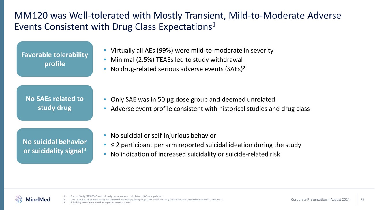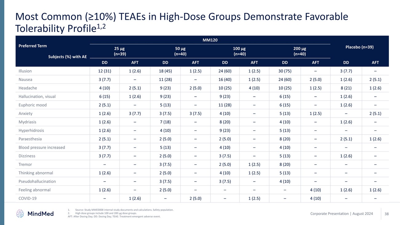 Corporate Presentation | August 2024 37 MM120 was Well - tolerated with Mostly Transient, Mild - to - Moderate Adverse Events Consistent with Drug Class Expectations 1 1. Source: Study MMED008 internal study documents and calculations. Safety population. 2. One serious adverse event (SAE) was observed in the 50 µg dose group: panic attack on study day 98 that was deemed not relate d t o treatment. 3. Suicidality assessment based on reported adverse events. • Virtually all AEs (99%) were mild - to - moderate in severity • Minimal (2.5%) TEAEs led to study withdrawal • No drug - related serious adverse events (SAEs) 2 Favorable tolerability profile No SAEs related to study drug No suicidal behavior or suicidality signal 3 • Only SAE was in 50 µg dose group and deemed unrelated • Adverse event profile consistent with historical studies and drug class • No suicidal or self - injurious behavior • ≤ 2 participant per arm reported suicidal ideation during the study • No indication of increased suicidality or suicide - related risk