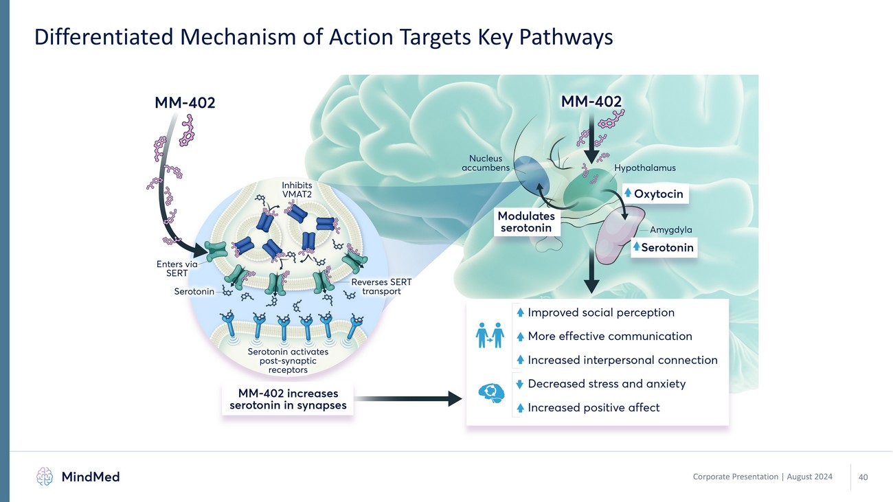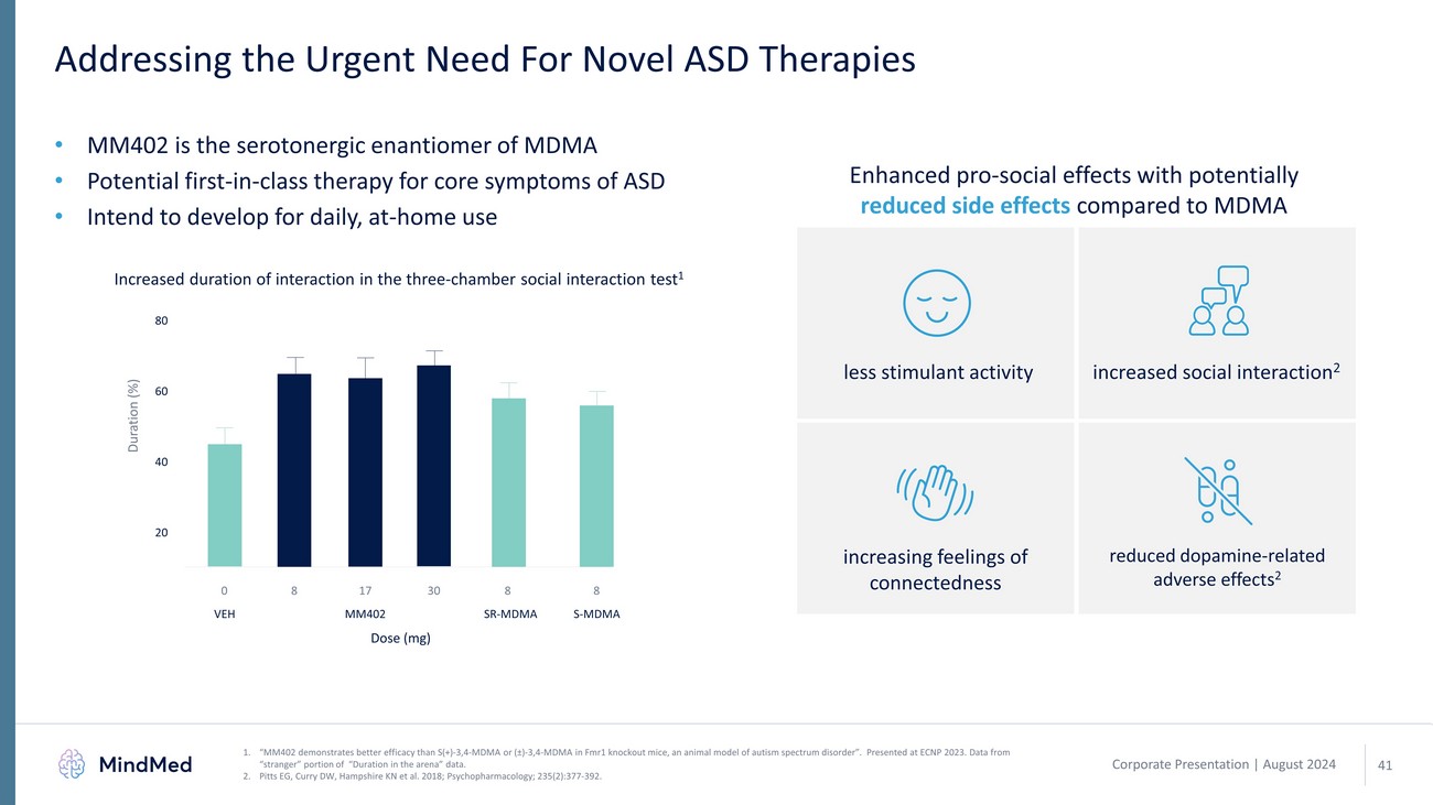 Corporate Presentation | August 2024 increasing feelings of connectedness • MM402 is the serotonergic enantiomer of MDMA • Potential first - in - class therapy for core symptoms of ASD • Intend to develop for daily, at - home use reduced dopamine - related adverse effects 2 Enhanced pro - social effects with potentially reduced side effects compared to MDMA less stimulant activity increased social interaction 2 Addressing the Urgent Need For Novel ASD Therapies 1. “MM402 demonstrates better efficacy than S(+) - 3,4 - MDMA or ( ± ) - 3,4 - MDMA in Fmr1 knockout mice, an animal model of autism spectrum disorder”. Presented at ECNP 2023. Data from “stranger” portion of “Duration in the arena” data. 2. Pitts EG, Curry DW, Hampshire KN et al. 2018; Psychopharmacology; 235(2):377 - 392. Duration (%) VEH S - MDMA Dose (mg) 20 40 60 80 MM402 SR - MDMA 0 8 17 30 8 8 Increased duration of interaction in the three - chamber social interaction test 1 41