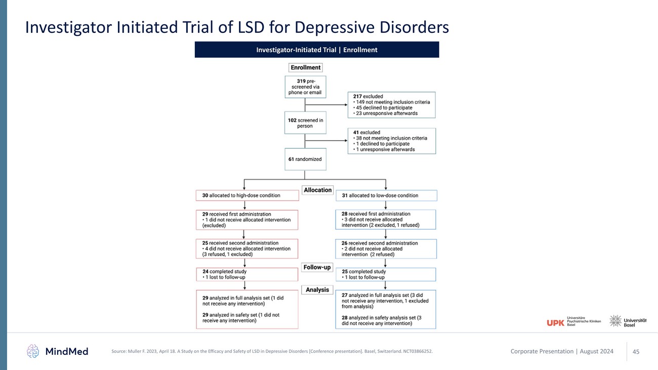 Corporate Presentation | August 2024 Investigator Initiated Trial of LSD for Depressive Disorders 1. Source: Muller F. 2023, April 18. A Study on the Efficacy and Safety of LSD in Depressive Disorders [Conference presentation] . B asel, Switzerland. NCT03866252. BDI: Beck Depression Inventory; IDS - C: Inventory of Depressive Symptomatology (clinician rated); IDS - SR: Inventory of Depressive Symptomatology (self - report); SCL - 90: Symptom Check List (90 item version); μ g: microgram 44 Investigator - Initiated Trial | Study Schematic Study Design Overview • IDS - C (primary at Week 9) • IDS - SR • BDI • SCL - 90 KEY ENTRY CRITERIA • Men and Women • Ages 25 and older • Diagnosis of MDD STUDY ENDPOINTS