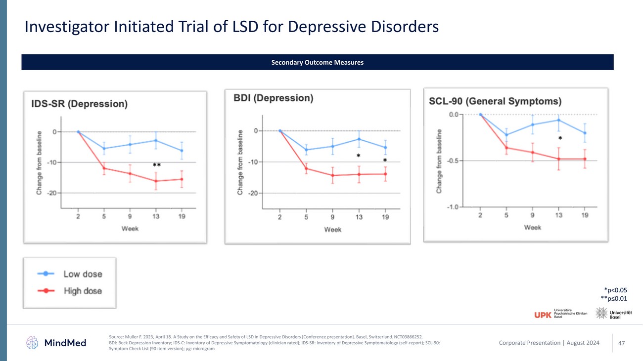 Corporate Presentation | August 2024 Investigator Initiated Trial of LSD for Depressive Disorders Source: Muller F. 2023, April 18. A Study on the Efficacy and Safety of LSD in Depressive Disorders [Conference presentation] . B asel, Switzerland. NCT03866252. IDS - C: Inventory of Depressive Symptomatology (clinician rated); μ g: microgram 46 Primary Outcome Measure | Change in IDS - C over Time *p<0.05 **p≤0.01 Change from Baseline to Week 9 • Low dose control: - 3.6 points • High dose: - 12.9 points Other Highlights • 50% reduction from baseline in high dose group
