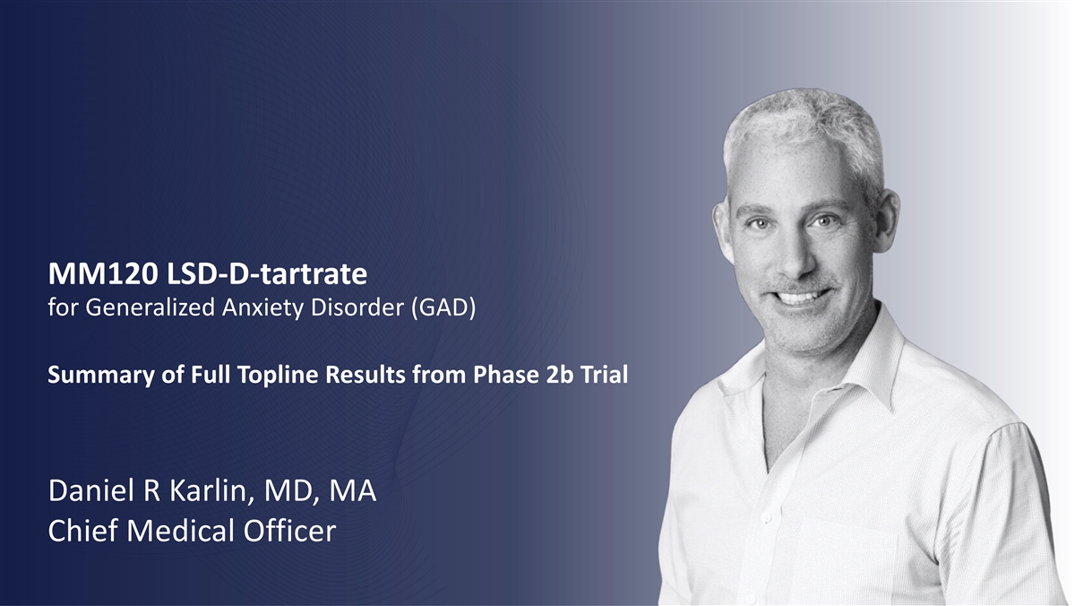 MM120 LSD-D-tartrate for Generalized Anxiety Disorder (GAD) Summary of Full Topline Results from Phase 2b Trial Daniel R Karlin, MD, MA Chief Medical Officer