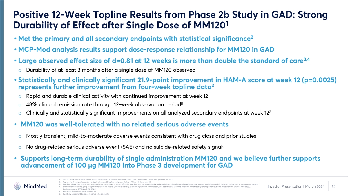PK Bridging Study Demonstrates Enhanced Product Profile for MM120 ODTs 1 Comparative PK Profile 2.5 MM120 Capsule Differentiated Performance of MM120 ODTs MM120 ODT 2 2 50% faster onset of action 1.5 3 17% improved bioavailability 1 4 0.5 23% increase in AUC at target conc. AUC 0 5 0 2 4 6 8 10 12 14 16 18 20 22 24 Reduced GI side effects Time (hours) 1. Company analysis of pharmacokinetic data from Study MM120-101. PK analysis based on n=24 subjects that completed both dosing sessions. 2. Based on time to reach target concentration of >1 ng/mL. 3. Based on comparison of geometric mean ratio of total area under the curve. Investor Presentation | March 2024 11 4. Based on ratio of mean AUC . Target concentrations defined as level above which perceptual effects are present. >1ng/mL 5. Based on a comparison between Phase 2b study of MM120 capsules in GAD versus PK bridging study of MM120 ODTs AUC: area under the curve; GI: gastrointestinal; ODT: orally dissolving tablet; PK: pharmacokinetics MM120 Concentration (ng/mL)