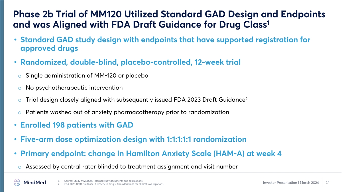 Positive 12-Week Topline Results from Phase 2b Study in GAD: Strong 1 Durability of Effect after Single Dose of MM120 2 • Met the primary and all secondary endpoints with statistical significance • MCP-Mod analysis results support dose-response relationship for MM120 in GAD 3,4 • Large observed effect size of d=0.81 at 12 weeks is more than double the standard of care o Durability of at least 3 months after a single dose of MM120 observed • Statistically and clinically significant 21.9-point improvement in HAM-A score at week 12 (p=0.0025) 3 represents further improvement from four-week topline data o Rapid and durable clinical activity with continued improvement at week 12 5 o 48% clinical remission rate through 12-week observation period 2 o Clinically and statistically significant improvements on all analyzed secondary endpoints at week 12 • MM120 was well-tolerated with no related serious adverse events o Mostly transient, mild-to-moderate adverse events consistent with drug class and prior studies 6 o No drug-related serious adverse event (SAE) and no suicide-related safety signal • Supports long-term durability of single administration MM120 and we believe further supports advancement of 100 µg MM120 into Phase 3 development for GAD 1. Source: Study MMED008 internal study documents and calculations. Individual group results reported on 100 µg dose group vs. placebo. 2. Represents all analyzed secondary endpoints in week 12 topline analysis, including HAM-A, CGI-S and MADRS. 3. Based on 100 µg dose group; HAM-A scores based on ANCOVA LS Mean. Effect size based on post hoc calculation by study statistician using LS Mean change between group and pooled standard deviation of ending HAM-A scores across groups. 4. Examination of baseline group assignment for all of the studies (20 studies utilizing the HAM-A (Hamilton Anxiety Scale) and 1 study using the PARS (Pediatric Anxiety Scale) for the primary outcome measurement. Source: RB Hidalgo, J 13 Investor Presentation | March 2024 Psychopharmacol. 2007 Nov;21(8):864-72. 5. Remission defined as HAM-A score of ≤7. 6. Suicidality assessment based on reported adverse events.