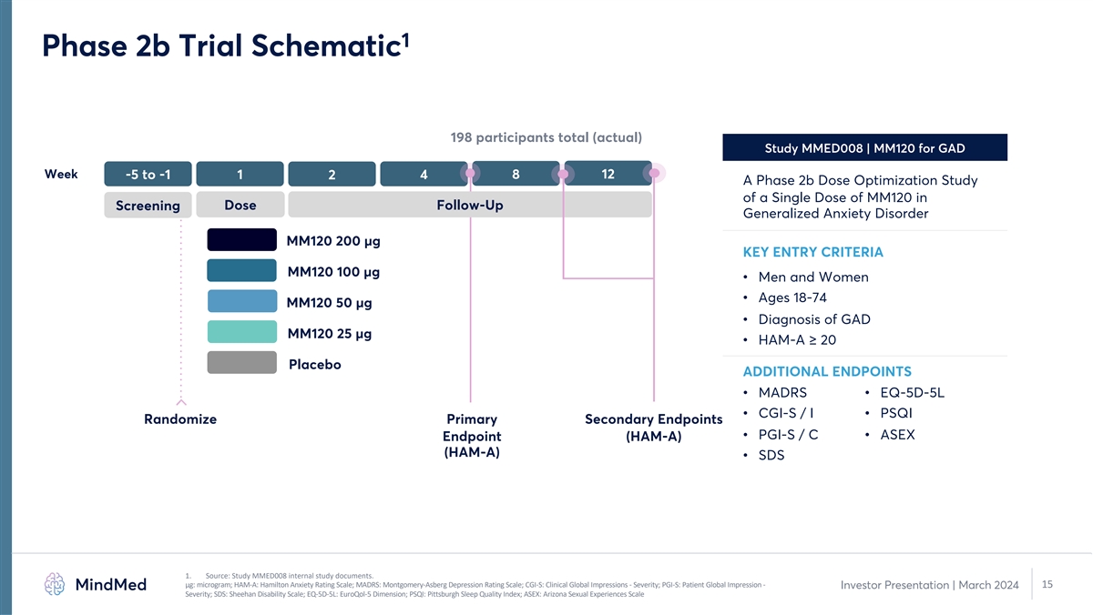 Phase 2b Trial of MM120 Utilized Standard GAD Design and Endpoints 1 and was Aligned with FDA Draft Guidance for Drug Class • Standard GAD study design with endpoints that have supported registration for approved drugs • Randomized, double-blind, placebo-controlled, 12-week trial o Single administration of MM-120 or placebo o No psychotherapeutic intervention 2 o Trial design closely aligned with subsequently issued FDA 2023 Draft Guidance o Patients washed out of anxiety pharmacotherapy prior to randomization • Enrolled 198 patients with GAD • Five-arm dose optimization design with 1:1:1:1:1 randomization • Primary endpoint: change in Hamilton Anxiety Scale (HAM-A) at week 4 o Assessed by central rater blinded to treatment assignment and visit number 1. Source: Study MMED008 internal study documents and calculations. 14 Investor Presentation | March 2024 2. FDA 2023 Draft Guidance: Psychedelic Drugs: Considerations for Clinical Investigations.