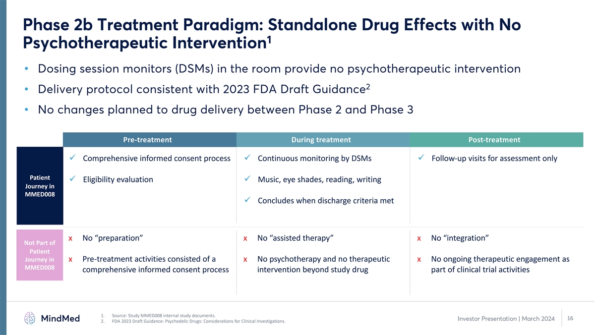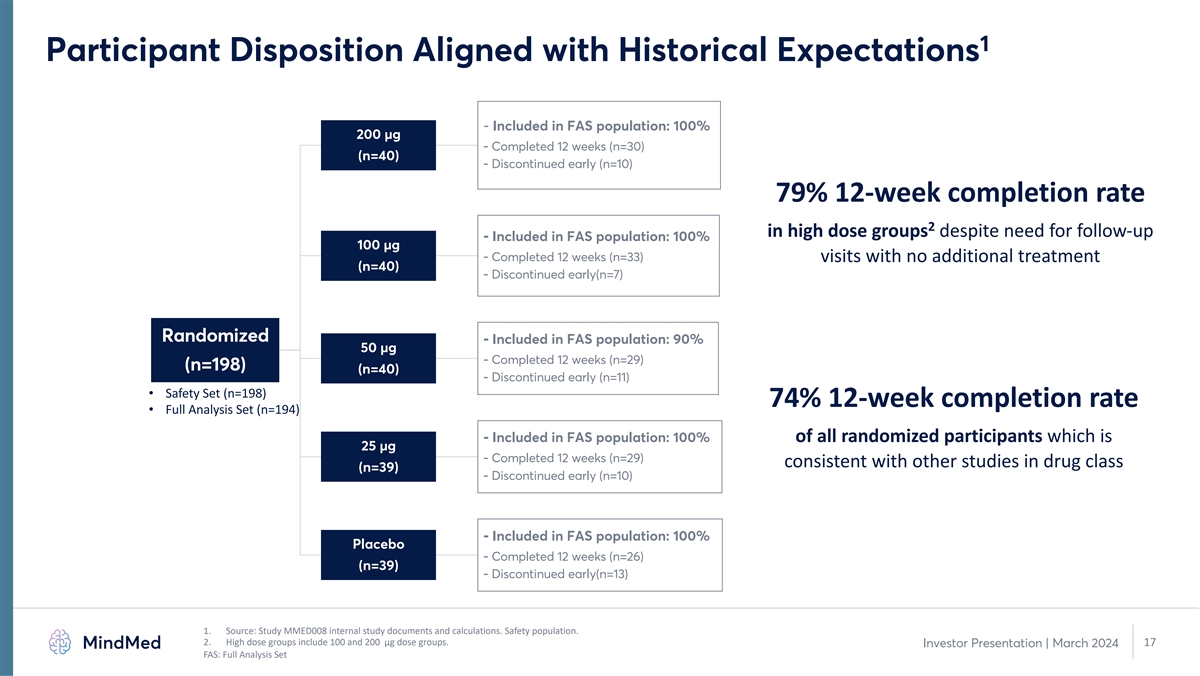 Phase 2b Treatment Paradigm: Standalone Drug Effects with No 1 Psychotherapeutic Intervention • Dosing session monitors (DSMs) in the room provide no psychotherapeutic intervention 2 • Delivery protocol consistent with 2023 FDA Draft Guidance • No changes planned to drug delivery between Phase 2 and Phase 3 Pre-treatment During treatment Post-treatment ü Comprehensive informed consent process ü Continuous monitoring by DSMs ü Follow-up visits for assessment only Patient ü Eligibility evaluation ü Music, eye shades, reading, writing Journey in MMED008 ü Concludes when discharge criteria met x No “preparation” x No “assisted therapy” x No “integration” Not Part of Patient Journey in x Pre-treatment activities consisted of a x No psychotherapy and no therapeutic x No ongoing therapeutic engagement as MMED008 comprehensive informed consent process intervention beyond study drug part of clinical trial activities 1. Source: Study MMED008 internal study documents. 16 Investor Presentation | March 2024 2. FDA 2023 Draft Guidance: Psychedelic Drugs: Considerations for Clinical Investigations.