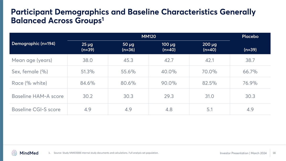 1 Participant Disposition Aligned with Historical Expectations - Included in FAS population: 100% 200 µg - Completed 12 weeks (n=30) (n=40) - Discontinued early (n=10) 79% 12-week completion rate 2 in high dose groups despite need for follow-up - Included in FAS population: 100% 100 µg - Completed 12 weeks (n=33) visits with no additional treatment (n=40) - Discontinued early(n=7) Randomized - Included in FAS population: 90% 50 µg - Completed 12 weeks (n=29) (n=198) (n=40) - Discontinued early (n=11) • Safety Set (n=198) 74% 12-week completion rate • Full Analysis Set (n=194) - Included in FAS population: 100% of all randomized participants which is 25 µg - Completed 12 weeks (n=29) consistent with other studies in drug class (n=39) - Discontinued early (n=10) - Included in FAS population: 100% Placebo - Completed 12 weeks (n=26) (n=39) - Discontinued early(n=13) 1. Source: Study MMED008 internal study documents and calculations. Safety population. 2. High dose groups include 100 and 200 µg dose groups. 17 Investor Presentation | March 2024 FAS: Full Analysis Set
