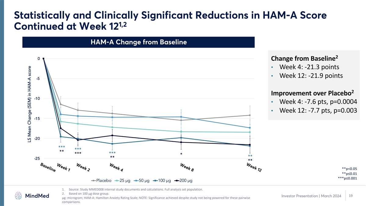 Participant Demographics and Baseline Characteristics Generally 1 Balanced Across Groups MM120 Placebo Demographic (n=194) 25 µg 50 µg 100 µg 200 µg (n=39) (n=36) (n=40) (n=40) (n=39) Mean age (years) 38.0 45.3 42.7 42.1 38.7 Sex, female (%) 51.3% 55.6% 40.0% 70.0% 66.7% Race (% white) 84.6% 80.6% 90.0% 82.5% 76.9% Baseline HAM-A score 30.2 30.3 29.3 31.0 30.3 Baseline CGI-S score 4.9 4.9 4.8 5.1 4.9 1. Source: Study MMED008 internal study documents and calculations. Full analysis set population. 18 Investor Presentation | March 2024