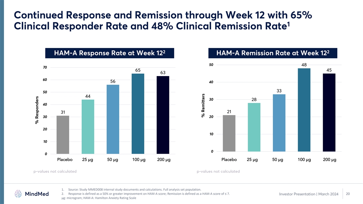 Week 12 Week 8 Week 4 Week 2 Week 1 Baseline Statistically and Clinically Significant Reductions in HAM-A Score 1,2 Continued at Week 12 HAM-A Change from Baseline 2 0 Change from Baseline • Week 4: -21.3 points • Week 12: -21.9 points -5 2 Improvement over Placebo -10 • Week 4: -7.6 pts, p=0.0004 • Week 12: -7.7 pts, p=0.003 -15 -20 *** *** ** *** *** * ** -25 ** ** **p<0.05 **p≤0.01 ***p≤0.001 Placebo 25 µg 50 µg 100 µg 200 µg 1. Source: Study MMED008 internal study documents and calculations. Full analysis set population. 2. Based on 100 µg dose group. 19 Investor Presentation | March 2024 μg: microgram; HAM-A: Hamilton Anxiety Rating Scale; NOTE: Significance achieved despite study not being powered for these pairwise comparisons. LS Mean Change (SEM) in HAM-A score
