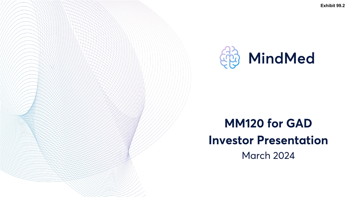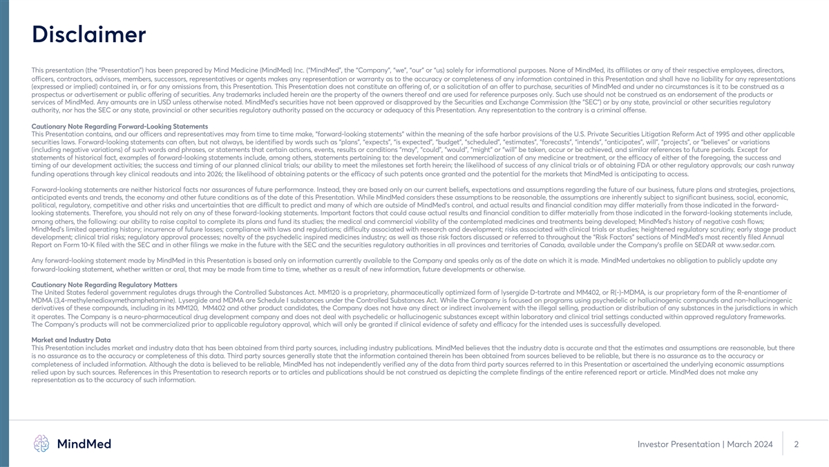 Disclaimer This presentation (the “Presentation”) has been prepared by Mind Medicine (MindMed) Inc. (“MindMed”, the “Company”, “we”, “our” or “us) solely for informational purposes. None of MindMed, its affiliates or any of their respective employees, directors, officers, contractors, advisors, members, successors, representatives or agents makes any representation or warranty as to the accuracy or completeness of any information contained in this Presentation and shall have no liability for any representations (expressed or implied) contained in, or for any omissions from, this Presentation. This Presentation does not constitute an offering of, or a solicitation of an offer to purchase, securities of MindMed and under no circumstances is it to be construed as a prospectus or advertisement or public offering of securities. Any trademarks included herein are the property of the owners thereof and are used for reference purposes only. Such use should not be construed as an endorsement of the products or services of MindMed. Any amounts are in USD unless otherwise noted. MindMed’s securities have not been approved or disapproved by the Securities and Exchange Commission (the SEC ) or by any state, provincial or other securities regulatory authority, nor has the SEC or any state, provincial or other securities regulatory authority passed on the accuracy or adequacy of this Presentation. Any representation to the contrary is a criminal offense. Cautionary Note Regarding Forward-Looking Statements This Presentation contains, and our officers and representatives may from time to time make, “forward-looking statements” within the meaning of the safe harbor provisions of the U.S. Private Securities Litigation Reform Act of 1995 and other applicable securities laws. Forward-looking statements can often, but not always, be identified by words such as “plans”, “expects”, “is expected”, “budget”, “scheduled”, “estimates”, “forecasts”, “intends”, “anticipates”, will”, “projects”, or “believes” or variations (including negative variations) of such words and phrases, or statements that certain actions, events, results or conditions “may”, “could”, “would”, “might” or “will” be taken, occur or be achieved, and similar references to future periods. Except for statements of historical fact, examples of forward-looking statements include, among others, statements pertaining to: the development and commercialization of any medicine or treatment, or the efficacy of either of the foregoing, the success and timing of our development activities; the success and timing of our planned clinical trials; our ability to meet the milestones set forth herein; the likelihood of success of any clinical trials or of obtaining FDA or other regulatory approvals; our cash runway funding operations through key clinical readouts and into 2026; the likelihood of obtaining patents or the efficacy of such patents once granted and the potential for the markets that MindMed is anticipating to access. Forward-looking statements are neither historical facts nor assurances of future performance. Instead, they are based only on our current beliefs, expectations and assumptions regarding the future of our business, future plans and strategies, projections, anticipated events and trends, the economy and other future conditions as of the date of this Presentation. While MindMed considers these assumptions to be reasonable, the assumptions are inherently subject to significant business, social, economic, political, regulatory, competitive and other risks and uncertainties that are difficult to predict and many of which are outside of MindMed’s control, and actual results and financial condition may differ materially from those indicated in the forward- looking statements. Therefore, you should not rely on any of these forward-looking statements. Important factors that could cause actual results and financial condition to differ materially from those indicated in the forward-looking statements include, among others, the following: our ability to raise capital to complete its plans and fund its studies; the medical and commercial viability of the contemplated medicines and treatments being developed; MindMed’s history of negative cash flows; MindMed’s limited operating history; incurrence of future losses; compliance with laws and regulations; difficulty associated with research and development; risks associated with clinical trials or studies; heightened regulatory scrutiny; early stage product development; clinical trial risks; regulatory approval processes; novelty of the psychedelic inspired medicines industry; as well as those risk factors discussed or referred to throughout the “Risk Factors” sections of MindMed’s most recently filed Annual Report on Form 10-K filed with the SEC and in other filings we make in the future with the SEC and the securities regulatory authorities in all provinces and territories of Canada, available under the Company’s profile on SEDAR at www.sedar.com. Any forward-looking statement made by MindMed in this Presentation is based only on information currently available to the Company and speaks only as of the date on which it is made. MindMed undertakes no obligation to publicly update any forward-looking statement, whether written or oral, that may be made from time to time, whether as a result of new information, future developments or otherwise. Cautionary Note Regarding Regulatory Matters The United States federal government regulates drugs through the Controlled Substances Act. MM120 is a proprietary, pharmaceutically optimized form of lysergide D-tartrate and MM402, or R(-)-MDMA, is our proprietary form of the R-enantiomer of MDMA (3,4-methylenedioxymethamphetamine). Lysergide and MDMA are Schedule I substances under the Controlled Substances Act. While the Company is focused on programs using psyc