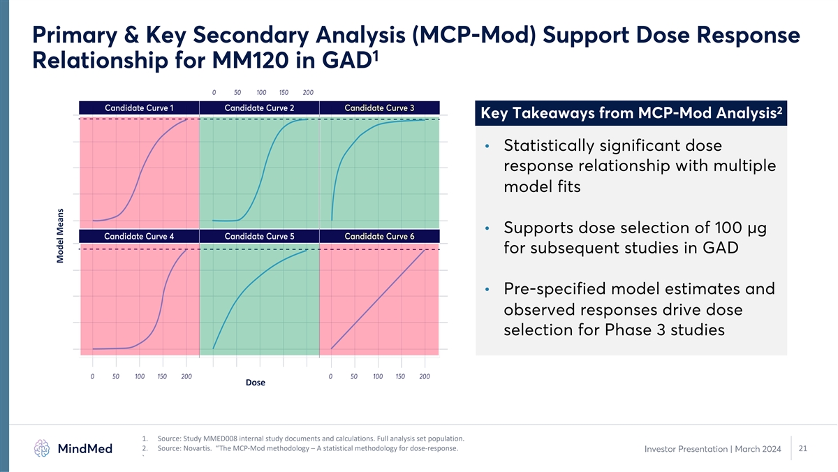 Continued Response and Remission through Week 12 with 65% 1 Clinical Responder Rate and 48% Clinical Remission Rate 2 2 HAM-A Response Rate at Week 12 HAM-A Remission Rate at Week 12 50 48 70 65 45 63 60 56 40 33 50 44 30 28 40 21 31 20 30 20 10 10 0 0 Placebo 25 µg 50 µg 100 µg 200 µg Placebo 25 µg 50 µg 100 µg 200 µg p-values not calculated p-values not calculated 1. Source: Study MMED008 internal study documents and calculations. Full analysis set population. 2. Response is defined as a 50% or greater improvement on HAM-A score; Remission is defined as a HAM-A score of ≤ 7. 20 Investor Presentation | March 2024 μg: microgram; HAM-A: Hamilton Anxiety Rating Scale % Responders % Remitters