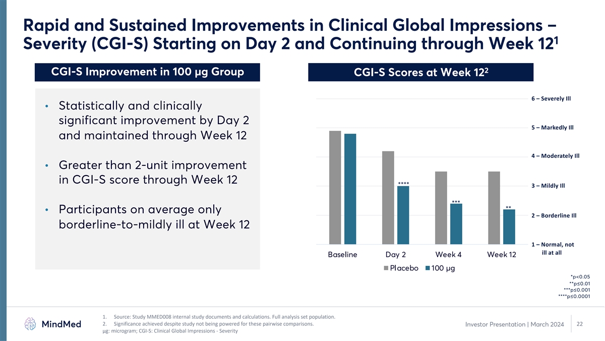Primary & Key Secondary Analysis (MCP-Mod) Support Dose Response 1 Relationship for MM120 in GAD 2 Key Takeaways from MCP-Mod Analysis • Statistically significant dose response relationship with multiple model fits • Supports dose selection of 100 µg for subsequent studies in GAD • Pre-specified model estimates and observed responses drive dose selection for Phase 3 studies Dose 1. Source: Study MMED008 internal study documents and calculations. Full analysis set population. 2. Source: Novartis. “The MCP-Mod methodology – A statistical methodology for dose-response. 21 Investor Presentation | March 2024 ` Model Means