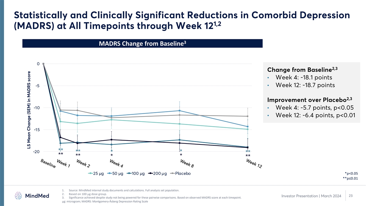Rapid and Sustained Improvements in Clinical Global Impressions – 1 Severity (CGI-S) Starting on Day 2 and Continuing through Week 12 2 CGI-S Improvement in 100 µg Group CGI-S Scores at Week 12 6 – Severely Ill • Statistically and clinically significant improvement by Day 2 5 – Markedly Ill and maintained through Week 12 4 – Moderately Ill • Greater than 2-unit improvement in CGI-S score through Week 12 **** 3 – Mildly Ill *** ** • Participants on average only 2 – Borderline Ill borderline-to-mildly ill at Week 12 1 – Normal, not ill at all Baseline Day 2 Week 4 Week 12 Placebo 100 µg *p<0.05 **p≤0.01 ***p≤0.001 ****p≤0.0001 1. Source: Study MMED008 internal study documents and calculations. Full analysis set population. 2. Significance achieved despite study not being powered for these pairwise comparisons. 22 Investor Presentation | March 2024 μg: microgram; CGI-S: Clinical Global Impressions - Severity
