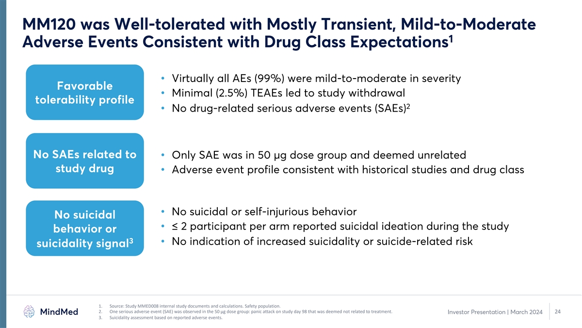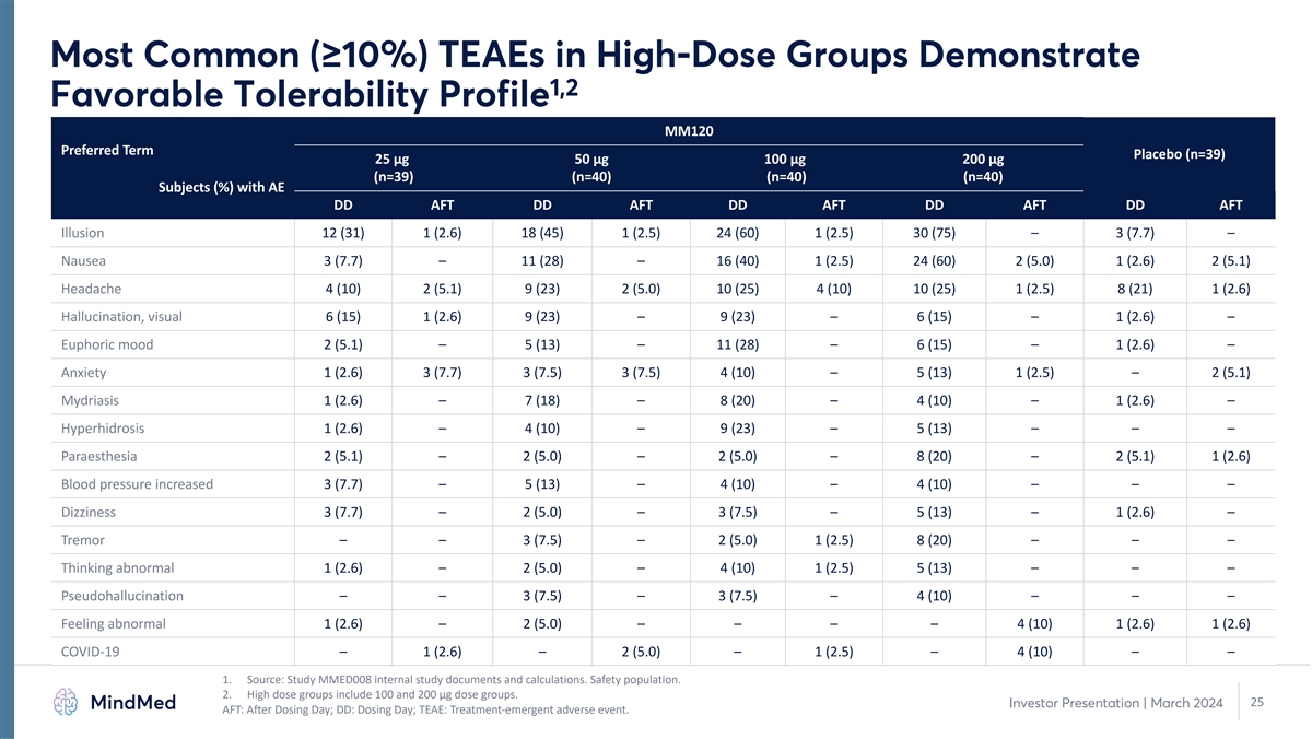 MM120 was Well-tolerated with Mostly Transient, Mild-to-Moderate 1 Adverse Events Consistent with Drug Class Expectations • Virtually all AEs (99%) were mild-to-moderate in severity Favorable • Minimal (2.5%) TEAEs led to study withdrawal tolerability profile 2 • No drug-related serious adverse events (SAEs) No SAEs related to • Only SAE was in 50 µg dose group and deemed unrelated study drug • Adverse event profile consistent with historical studies and drug class • No suicidal or self-injurious behavior No suicidal • ≤ 2 participant per arm reported suicidal ideation during the study behavior or 3 • No indication of increased suicidality or suicide-related risk suicidality signal 1. Source: Study MMED008 internal study documents and calculations. Safety population. 2. One serious adverse event (SAE) was observed in the 50 µg dose group: panic attack on study day 98 that was deemed not related to treatment. 24 Investor Presentation | March 2024 3. Suicidality assessment based on reported adverse events.