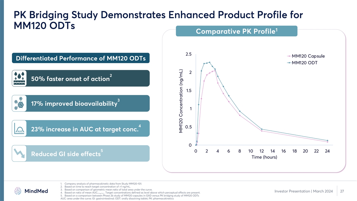 PK Bridging Study Demonstrates Enhanced Product Profile for MM120 ODTs 1 Comparative PK Profile 2.5 MM120 Capsule Differentiated Performance of MM120 ODTs MM120 ODT 2 2 50% faster onset of action 1.5 3 17% improved bioavailability 1 4 0.5 23% increase in AUC at target conc. AUC 0 5 0 2 4 6 8 10 12 14 16 18 20 22 24 Reduced GI side effects Time (hours) 1. Company analysis of pharmacokinetic data from Study MM120-101. 2. Based on time to reach target concentration of >1 ng/mL. 3. Based on comparison of geometric mean ratio of total area under the curve. Investor Presentation | March 2024 27 4. Based on ratio of mean AUC . Target concentrations defined as level above which perceptual effects are present. >1ng/mL 5. Based on a comparison between Phase 2b study of MM120 capsules in GAD versus PK bridging study of MM120 ODTs AUC: area under the curve; GI: gastrointestinal; ODT: orally dissolving tablet; PK: pharmacokinetics MM120 Concentration (ng/mL)