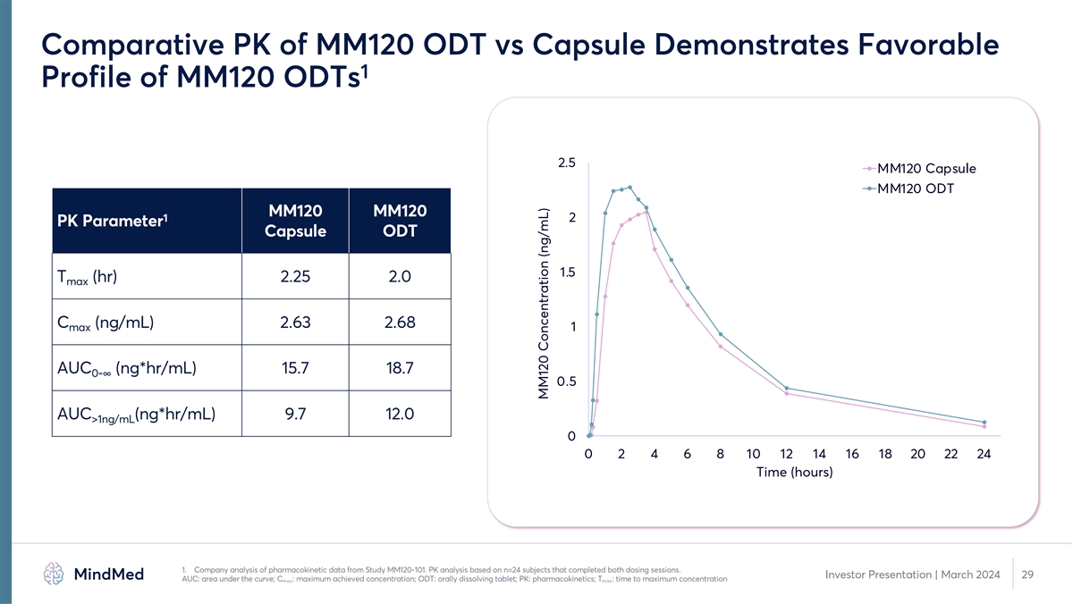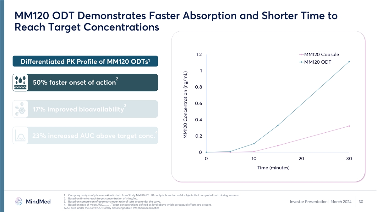 Comparative PK of MM120 ODT vs Capsule Demonstrates Favorable 1 Profile of MM120 ODTs 2.5 MM120 Capsule MM120 ODT MM120 MM120 1 2 PK Parameter Capsule ODT 1.5 T (hr) 2.25 2.0 max C (ng/mL) 2.63 2.68 max 1 AUC (ng*hr/mL) 15.7 18.7 0-∞ 0.5 AUC (ng*hr/mL) 9.7 12.0 >1ng/mL 0 0 2 4 6 8 10 12 14 16 18 20 22 24 Time (hours) 1. Company analysis of pharmacokinetic data from Study MM120-101. PK analysis based on n=24 subjects that completed both dosing sessions. Investor Presentation | March 2024 29 AUC: area under the curve; C : maximum achieved concentration; ODT: orally dissolving tablet; PK: pharmacokinetics; T : time to maximum concentration max max MM120 Concentration (ng/mL)