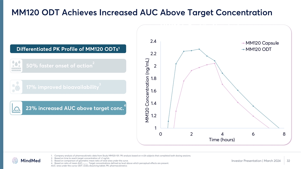 1 MM120 ODT Demonstrates Improved Bioavailability 1 Differentiated PK Profile of MM120 ODTs C max 2 50% faster onset of action GMR: 1.02 3 17% improved bioavailability AUC 0-∞ 4 GMR: 1.17 23% increased AUC above target conc. AUC 80% 100% 125% GMR Relative to Capsule 1. Company analysis of pharmacokinetic data from Study MM120-101. PK analysis based on n=24 subjects that completed both dosing sessions. 2. Based on time to reach target concentration of >1 ng/mL. 3. Based on comparison of geometric mean ratio of total area under the curve. Investor Presentation | March 2024 31 4. Based on ratio of mean AUC . Target concentrations defined as level above which perceptual effects are present. >1ng/mL AUC: area under the curve; GMR: geometric mean ratio; ODT: orally dissolving tablet; PK: pharmacokinetics