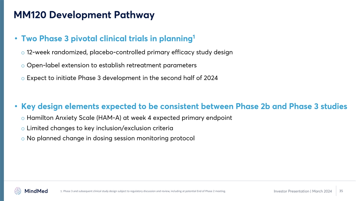 Multiple Studies Support Phase 3 Development of MM120 1 • Achieved goals of Phase 2 development o Characterized dose-response to inform dose selection in GAD o Large, statistically significant and clinically meaningful effect in GAD o Rapid and durable therapeutic benefits on validated endpoint o Standalone drug effect in absence of psychotherapeutic intervention • Multiple double-blind, placebo-controlled studies supporting activity of MM120 o Phase 2b randomized, placebo-controlled dose optimization trial in GAD (Study MMED008) o One prior modern, randomized, placebo-controlled IIT of lysergide in anxiety disorders o Over twenty legacy studies of lysergide in anxiety and other neurotic disorders • Phase 2b data supports dose selection and advancement into Phase 3 development 1. Source: Study MMED008 internal study documents and calculations. 34 Investor Presentation | March 2024