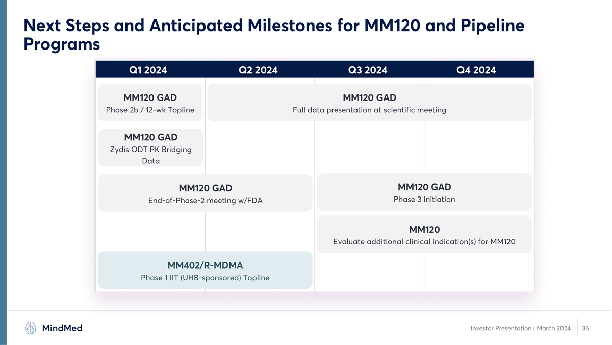 MM120 Development Pathway 1 • Two Phase 3 pivotal clinical trials in planning o 12-week randomized, placebo-controlled primary efficacy study design o Open-label extension to establish retreatment parameters o Expect to initiate Phase 3 development in the second half of 2024 • Key design elements expected to be consistent between Phase 2b and Phase 3 studies o Hamilton Anxiety Scale (HAM-A) at week 4 expected primary endpoint o Limited changes to key inclusion/exclusion criteria o No planned change in dosing session monitoring protocol 1. Phase 3 and subsequent clinical study design subject to regulatory discussion and review, including at potential End of Phase 2 meeting. 35 Investor Presentation | March 2024