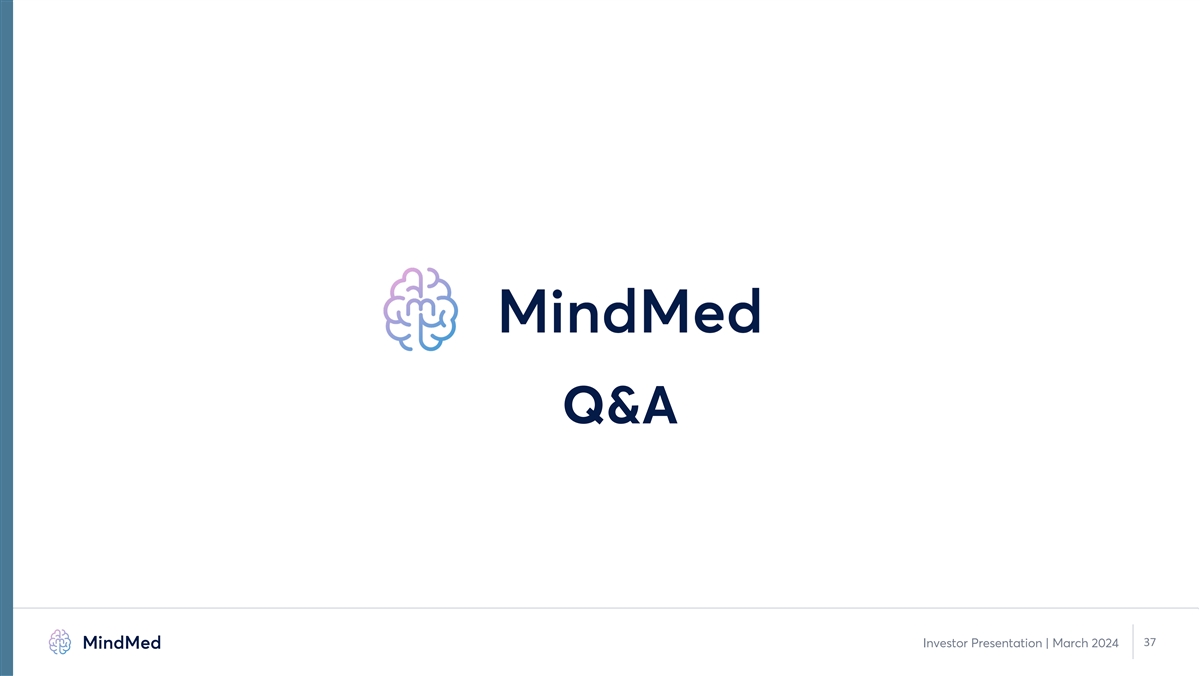 Next Steps and Anticipated Milestones for MM120 and Pipeline Programs Q1 2024 Q2 2024 Q3 2024 Q4 2024 MM120 GAD MM120 GAD Phase 2b / 12-wk Topline Full data presentation at scientific meeting MM120 GAD Zydis ODT PK Bridging Data MM120 GAD MM120 GAD Phase 3 initiation End-of-Phase-2 meeting w/FDA MM120 Evaluate additional clinical indication(s) for MM120 MM402/R-MDMA Phase 1 IIT (UHB-sponsored) Topline Investor Presentation | March 2024 36