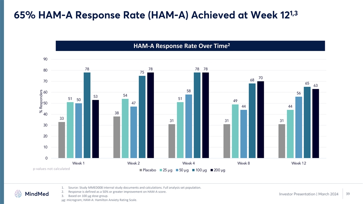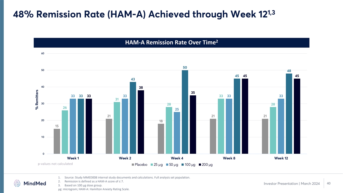1,3 65% HAM-A Response Rate (HAM-A) Achieved at Week 12 2 HAM-A Response Rate Over Time 90 78 78 78 78 80 75 70 68 70 65 63 58 60 56 54 53 51 51 50 49 50 47 44 44 38 40 33 31 31 31 30 20 10 0 Week 1 Week 2 Week 4 Week 8 Week 12 p-values not calculated Placebo 25 µg 50 µg 100 µg 200 µg 1. Source: Study MMED008 internal study documents and calculations. Full analysis set population. 2. Response is defined as a 50% or greater improvement on HAM-A score. 39 Investor Presentation | March 2024 3. Based on 100 µg dose group. μg: microgram; HAM-A: Hamilton Anxiety Rating Scale. % Responders