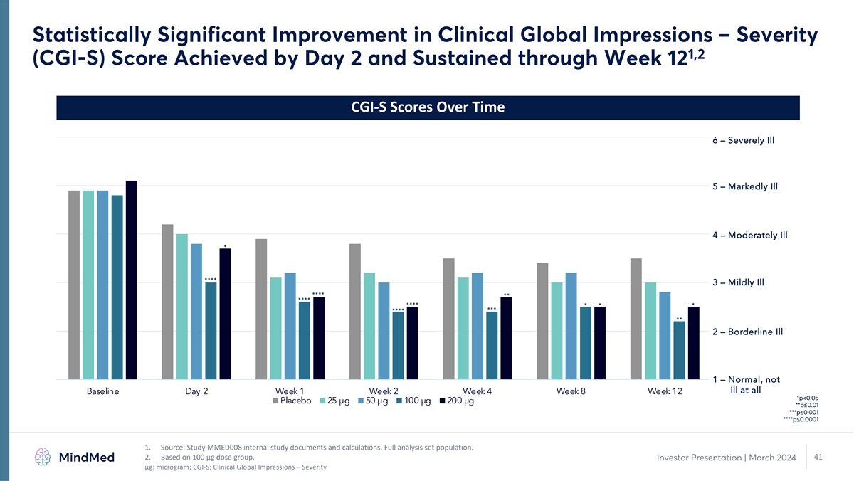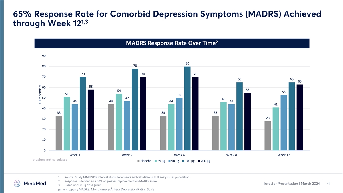Statistically Significant Improvement in Clinical Global Impressions – Severity 1,2 (CGI-S) Score Achieved by Day 2 and Sustained through Week 12 CGI-S Scores Over Time 6 – Severely Ill 5 – Markedly Ill 4 – Moderately Ill * **** 3 – Mildly Ill **** ** **** **** * * * *** **** ** 2 – Borderline Ill 1 – Normal, not ill at all Baseline Day 2 Week 1 Week 2 Week 4 Week 8 Week 12 *p<0.05 Placebo 25 µg 50 µg 100 µg 200 µg **p≤0.01 ***p≤0.001 ****p≤0.0001 1. Source: Study MMED008 internal study documents and calculations. Full analysis set population. 2. Based on 100 µg dose group. 41 Investor Presentation | March 2024 μg: microgram; CGI-S: Clinical Global Impressions – Severity