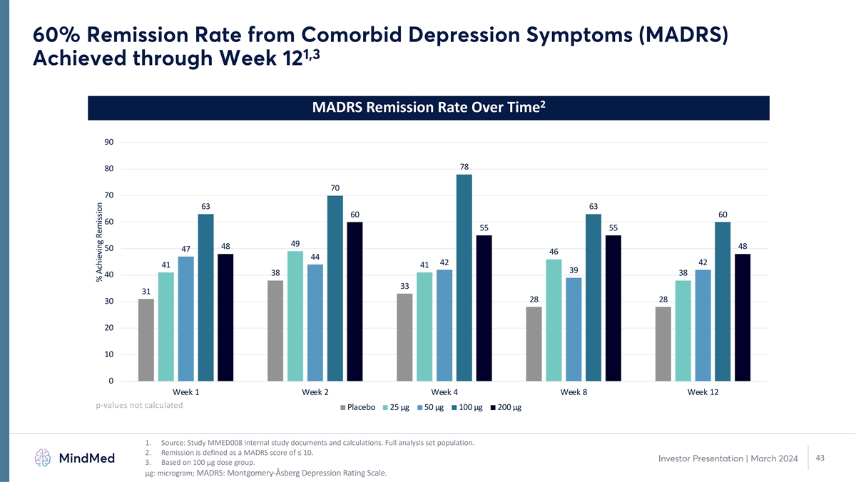 65% Response Rate for Comorbid Depression Symptoms (MADRS) Achieved 1,3 through Week 12 2 MADRS Response Rate Over Time 90 80 78 80 70 70 70 70 65 65 63 58 60 55 54 53 51 50 50 47 46 44 44 44 44 41 40 33 33 33 28 30 20 10 0 Week 1 Week 2 Week 4 Week 8 Week 12 p-values not calculated Placebo 25 µg 50 µg 100 µg 200 µg 1. Source: Study MMED008 internal study documents and calculations. Full analysis set population. 2. Response is defined as a 50% or greater improvement on MADRS score. 42 Investor Presentation | March 2024 3. Based on 100 µg dose group. μg: microgram; MADRS: Montgomery-Åsberg Depression Rating Scale % Responders