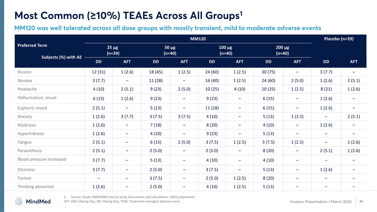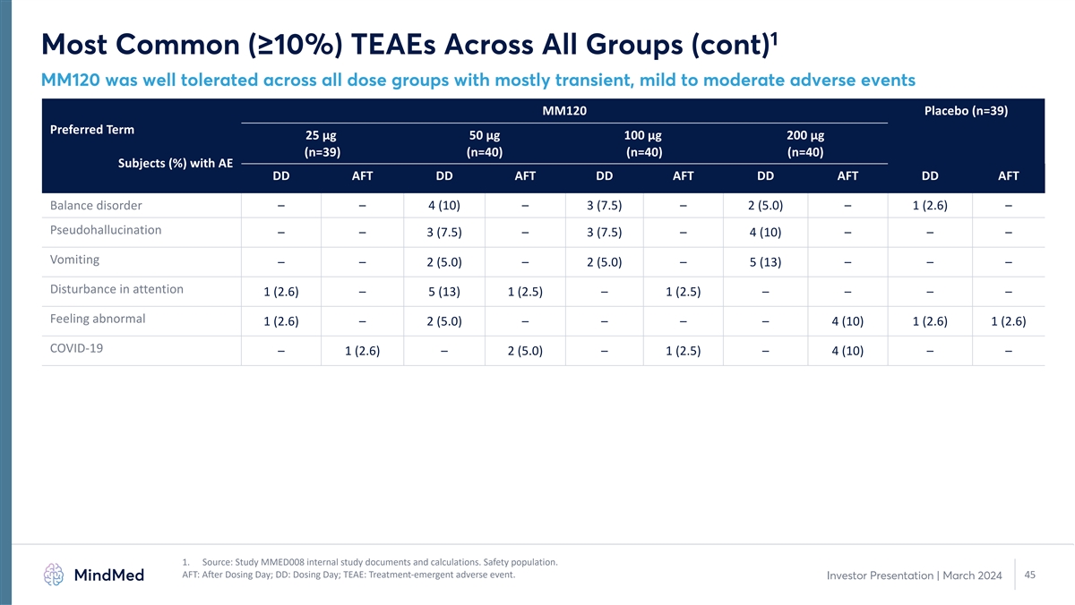 1 Most Common (≥10%) TEAEs Across All Groups MM120 was well tolerated across all dose groups with mostly transient, mild to moderate adverse events MM120 Placebo (n=39) Preferred Term 25 µg 50 µg 100 µg 200 µg (n=39) (n=40) (n=40) (n=40) Subjects (%) with AE DD AFT DD AFT DD AFT DD AFT DD AFT Illusion 12 (31) 1 (2.6) 18 (45) 1 (2.5) 24 (60) 1 (2.5) 30 (75) – 3 (7.7) – Nausea 3 (7.7) – 11 (28) – 16 (40) 1 (2.5) 24 (60) 2 (5.0) 1 (2.6) 2 (5.1) Headache 4 (10) 2 (5.1) 9 (23) 2 (5.0) 10 (25) 4 (10) 10 (25) 1 (2.5) 8 (21) 1 (2.6) Hallucination, visual 6 (15) 1 (2.6) 9 (23) – 9 (23) – 6 (15) – 1 (2.6) – Euphoric mood 2 (5.1) – 5 (13) – 11 (28) – 6 (15) – 1 (2.6) – Anxiety 1 (2.6) 3 (7.7) 3 (7.5) 3 (7.5) 4 (10) – 5 (13) 1 (2.5) – 2 (5.1) Mydriasis 1 (2.6) – 7 (18) – 8 (20) – 4 (10) – 1 (2.6) – Hyperhidrosis 1 (2.6) – 4 (10) – 9 (23) – 5 (13) – – – Fatigue 2 (5.1) – 6 (15) 2 (5.0) 3 (7.5) 1 (2.5) 3 (7.5) 1 (2.5) – 1 (2.6) Paraesthesia 2 (5.1) – 2 (5.0) – 2 (5.0) – 8 (20) – 2 (5.1) 1 (2.6) Blood pressure increased 3 (7.7) – 5 (13) – 4 (10) – 4 (10) – – – Dizziness 3 (7.7) – 2 (5.0) – 3 (7.5) – 5 (13) – 1 (2.6) – Tremor – – 3 (7.5) – 2 (5.0) 1 (2.5) 8 (20) – – – Thinking abnormal 1 (2.6) – 2 (5.0) – 4 (10) 1 (2.5) 5 (13) – – – 1. Source: Study MMED008 internal study documents and calculations. Safety population. AFT: After Dosing Day; DD: Dosing Day; TEAE: Treatment-emergent adverse event. 44 Investor Presentation | March 2024