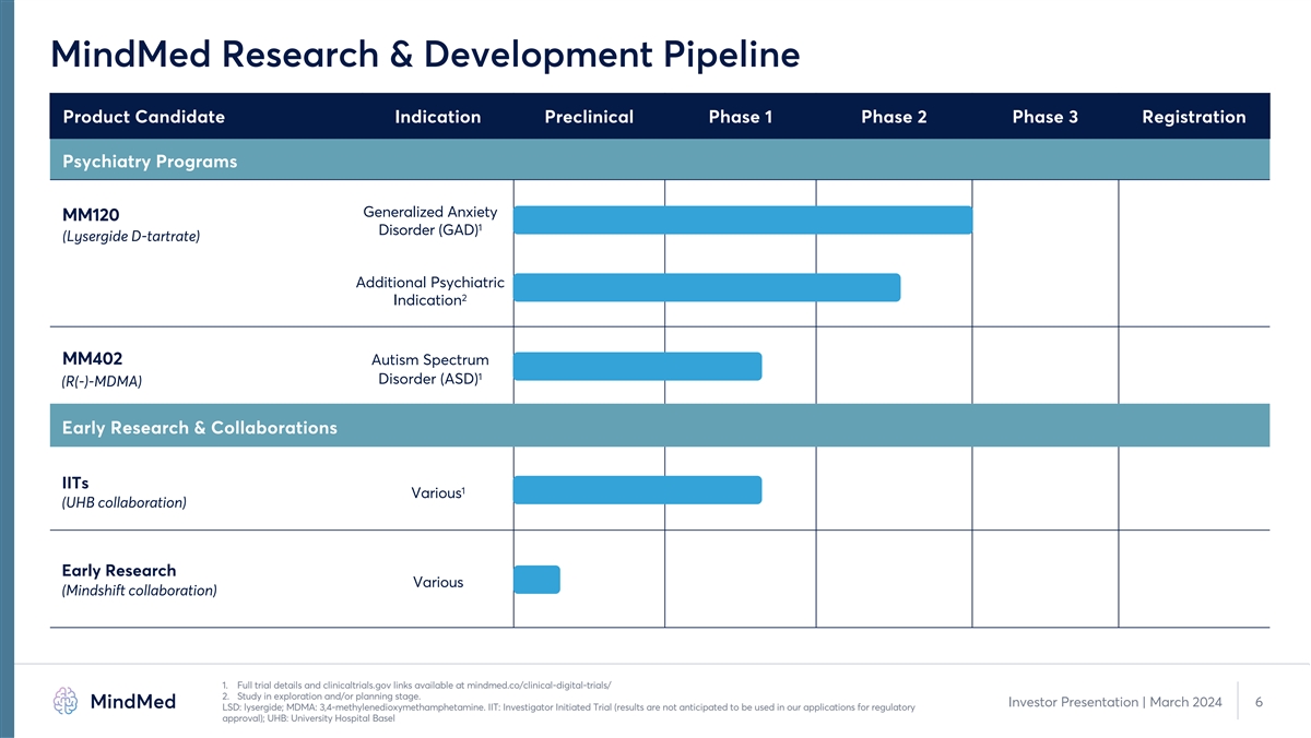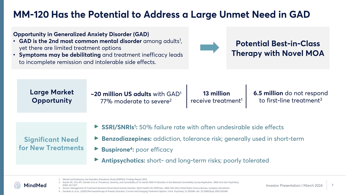 MindMed Research & Development Pipeline Product Candidate Indication Preclinical Phase 1 Phase 2 Phase 3 Registration Psychiatry Programs Generalized Anxiety MM120 1 Disorder (GAD) (Lysergide D-tartrate) Additional Psychiatric 2 Indication MM402 Autism Spectrum 1 Disorder (ASD) (R(-)-MDMA) Early Research & Collaborations IITs 1 Various (UHB collaboration) Early Research Various (Mindshift collaboration) 1. Full trial details and clinicaltrials.gov links available at mindmed.co/clinical-digital-trials/ 2. Study in exploration and/or planning stage. Investor Presentation | March 2024 6 LSD: lysergide; MDMA: 3,4-methylenedioxymethamphetamine. IIT: Investigator Initiated Trial (results are not anticipated to be used in our applications for regulatory approval); UHB: University Hospital Basel